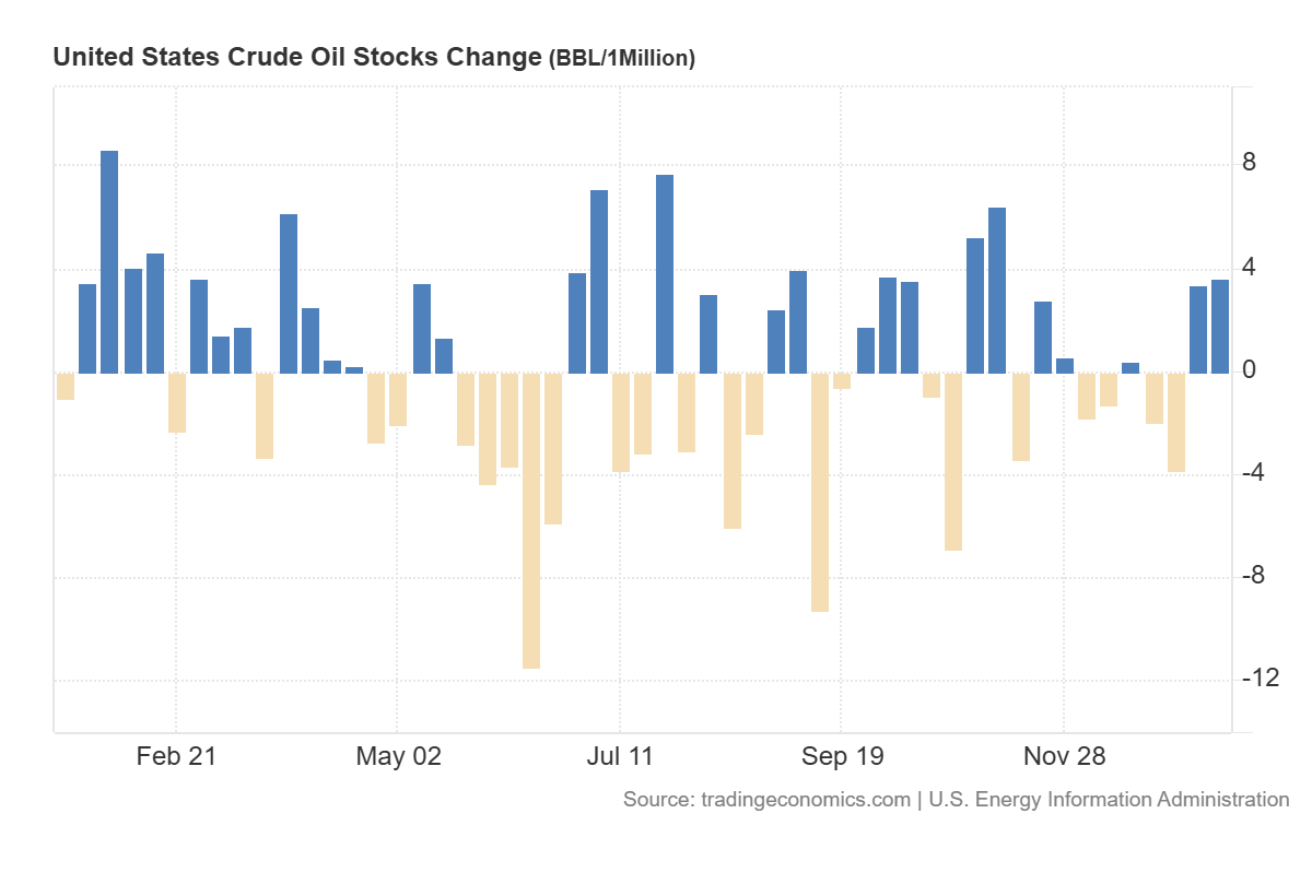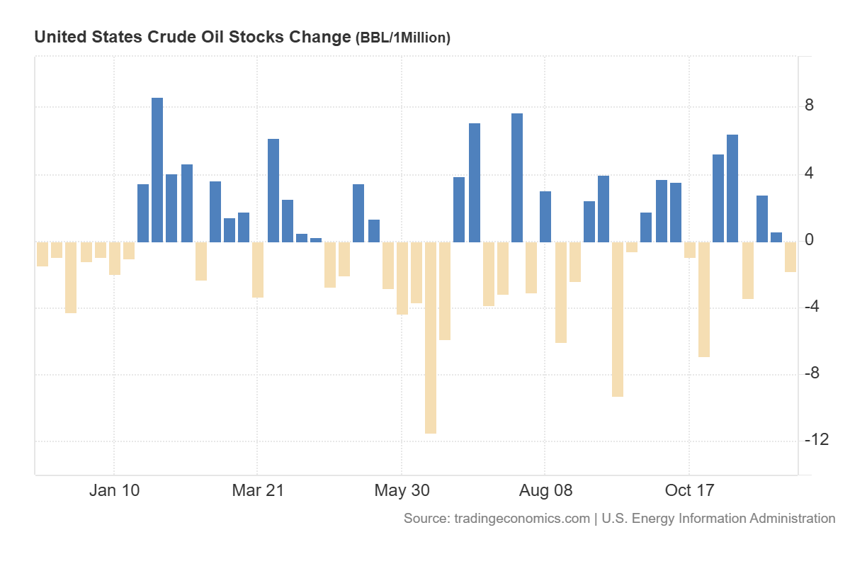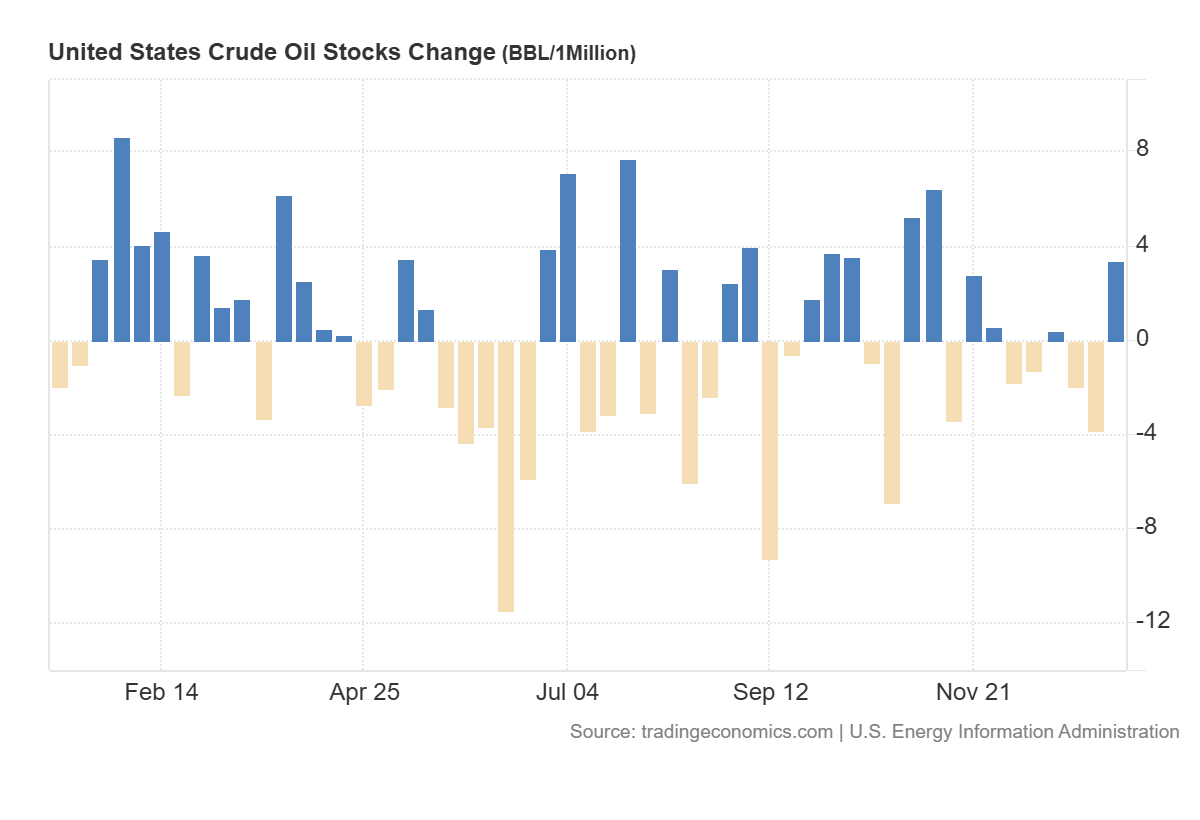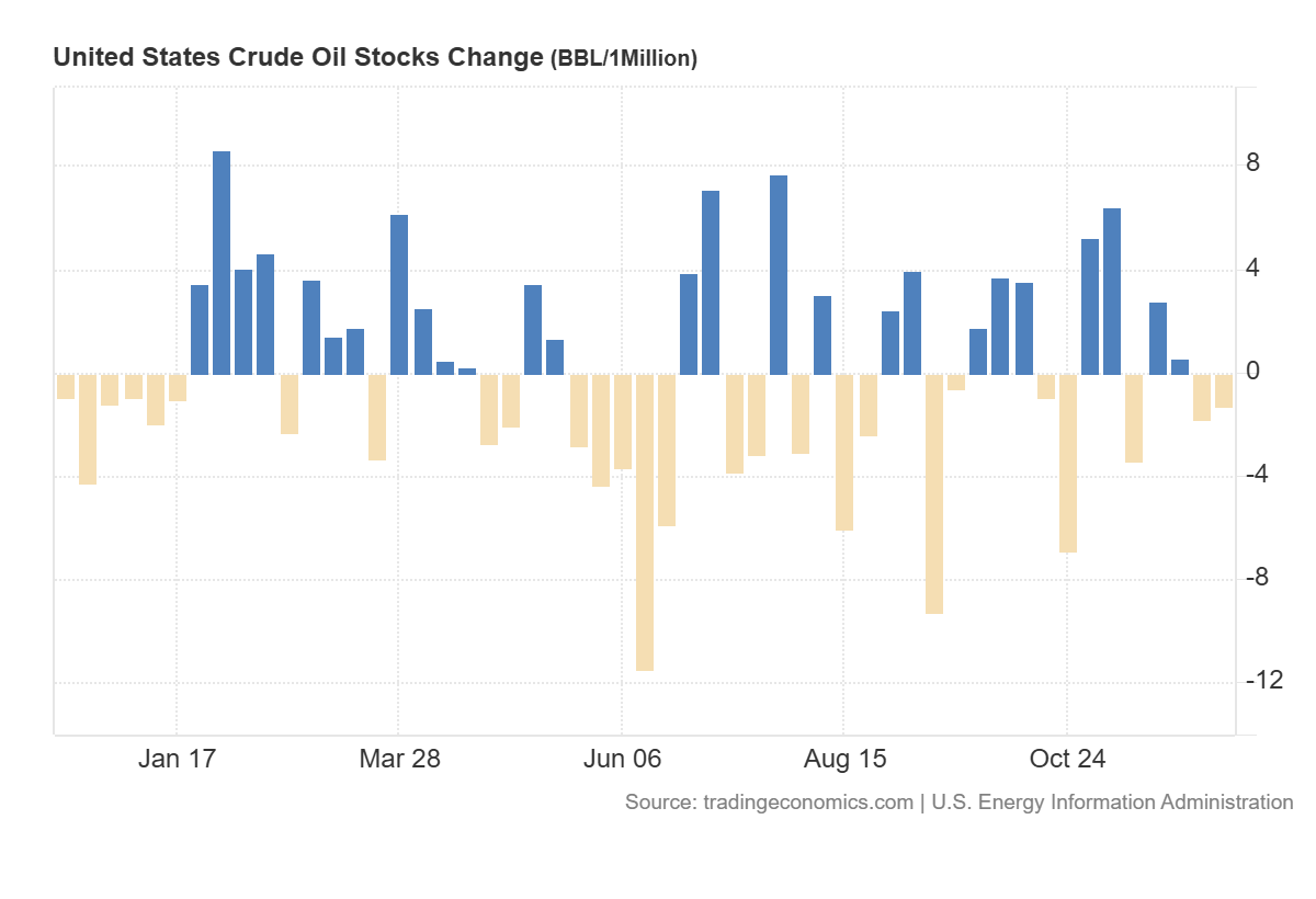 U.S. commercial crude oil inventories fell -2.3M bbl (vs +1.75M bbl expected) WoW to 423.8M bbl in the week ending Jan. 23, 2026, reflecting a modest draw alongside mixed refined product builds.