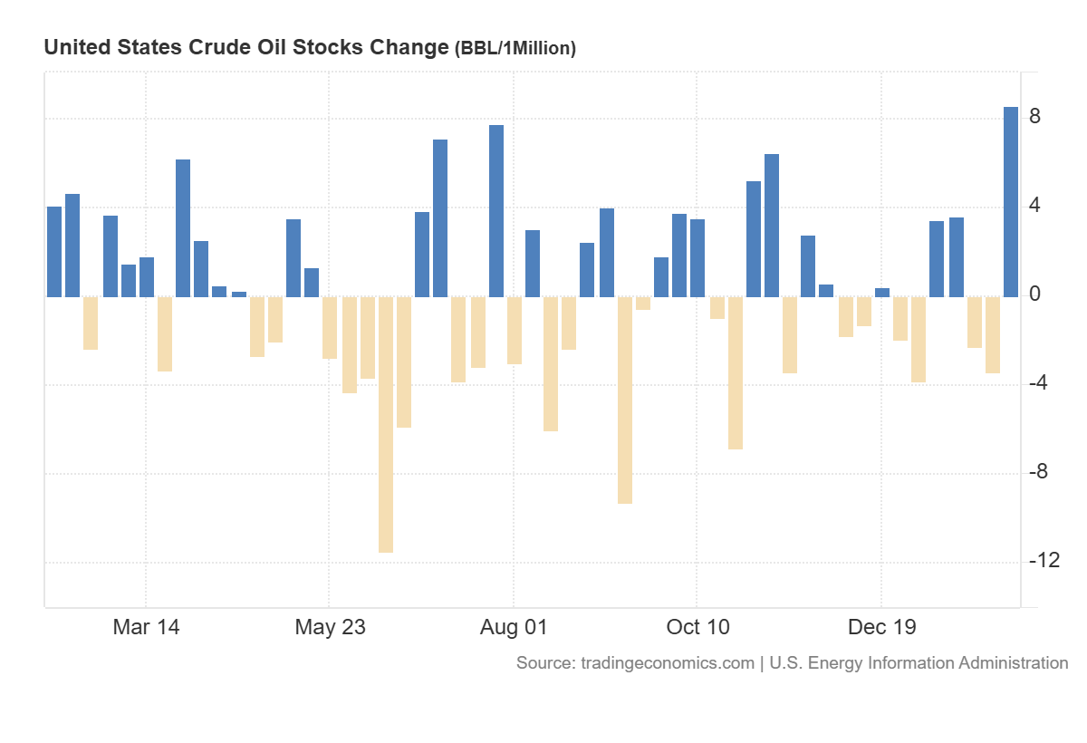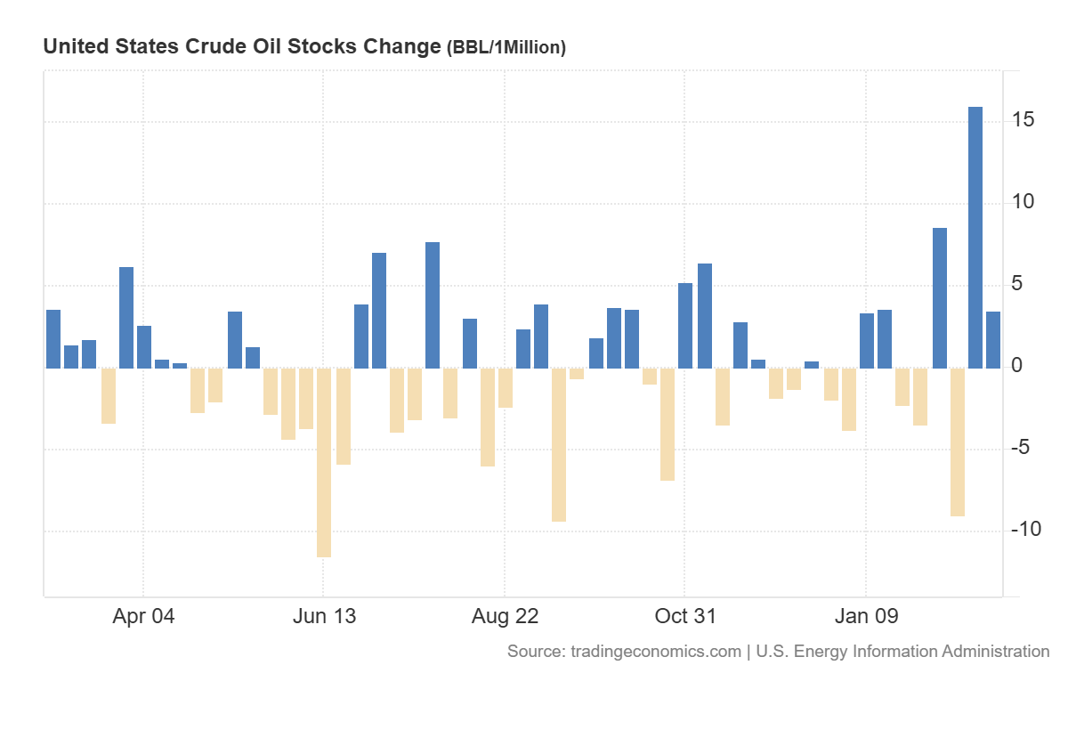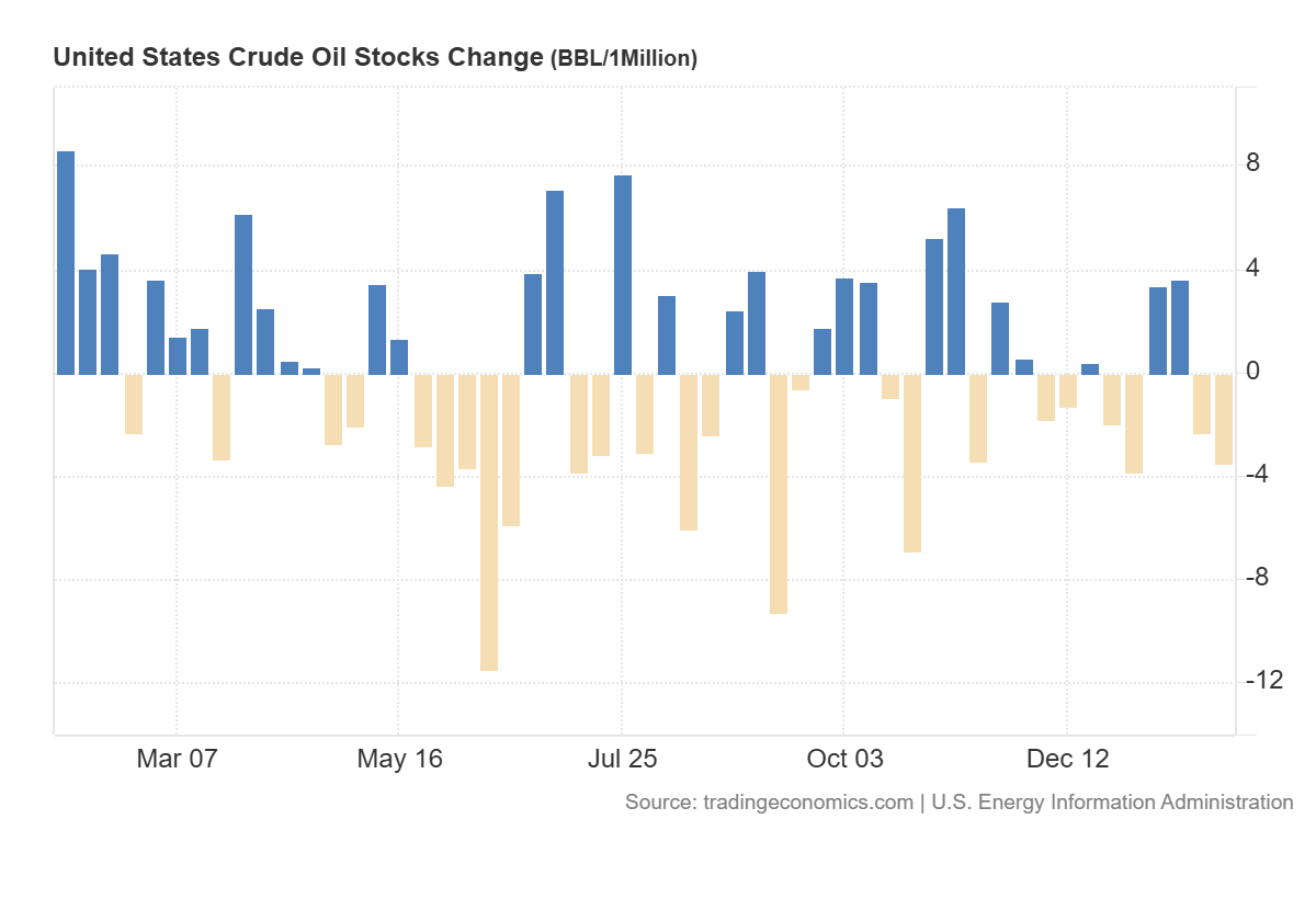 U.S. commercial crude oil inventories declined by -1.9M bbl to 422.9M bbl and stayed ~3% below the five-year average, indicating continued relative tightness in crude stocks.