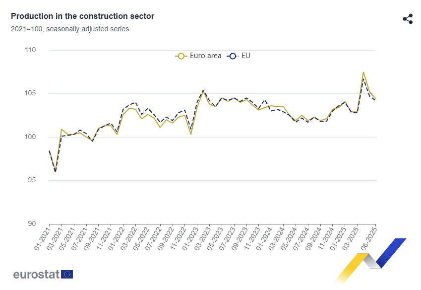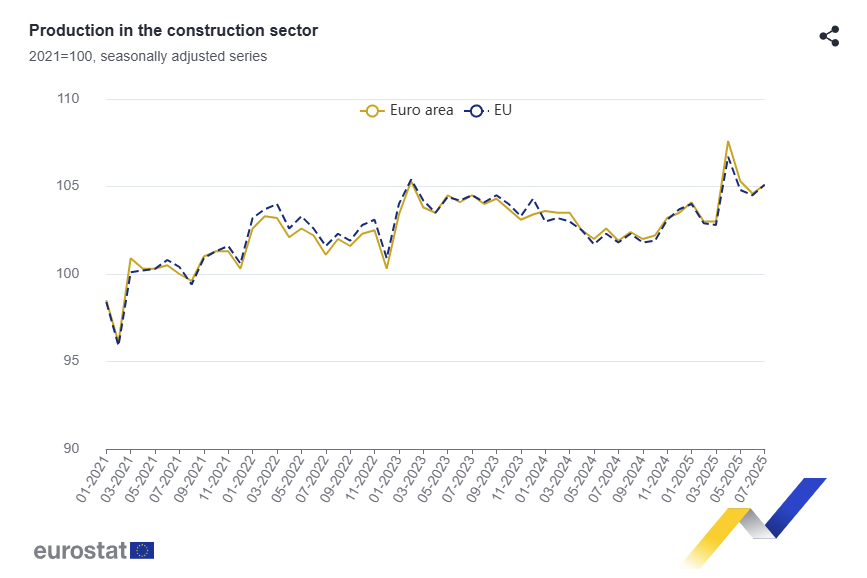 Euro area construction output rose +0.5% MoM in July 2025 (EU: +0.6% MoM) after falling in June, and was up +3.2% YoY (EU: +3.6% YoY), reflecting broad annual strength across sectors.