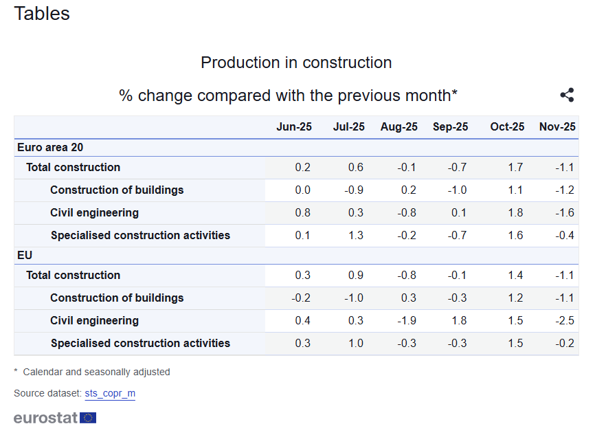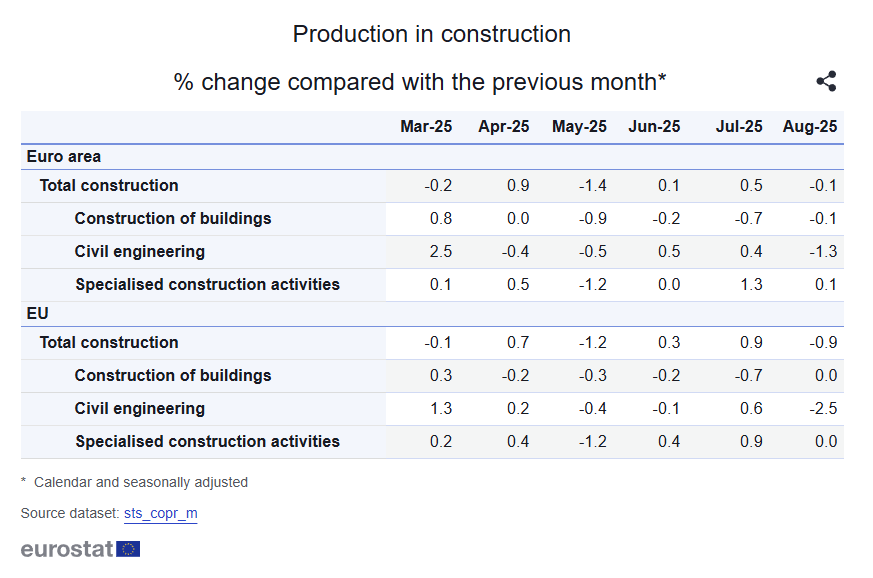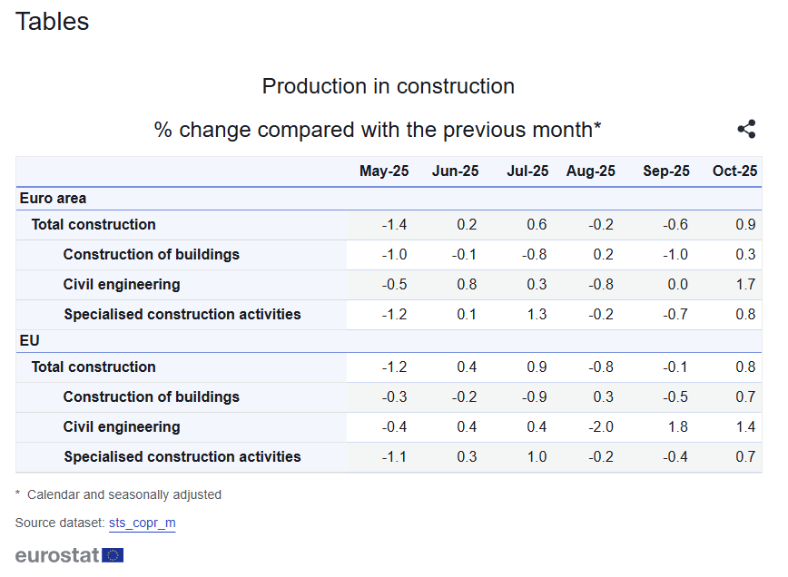 - EU sector detail: buildings +1.2% MoM, civil engineering +3.9% MoM, specialized activities +0.9% MoM, with civil engineering the strongest driver.