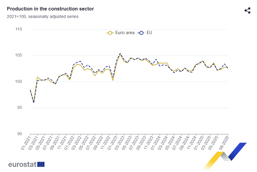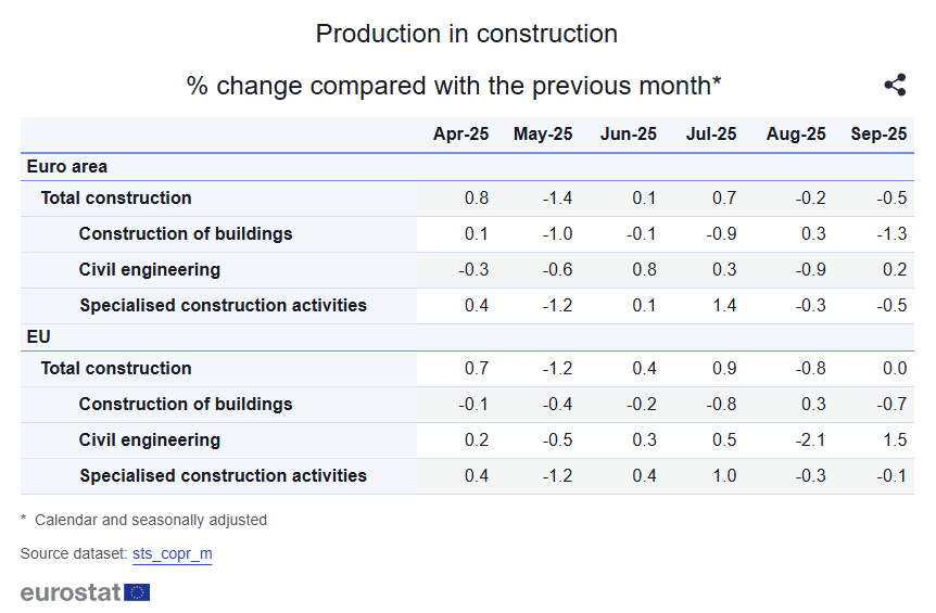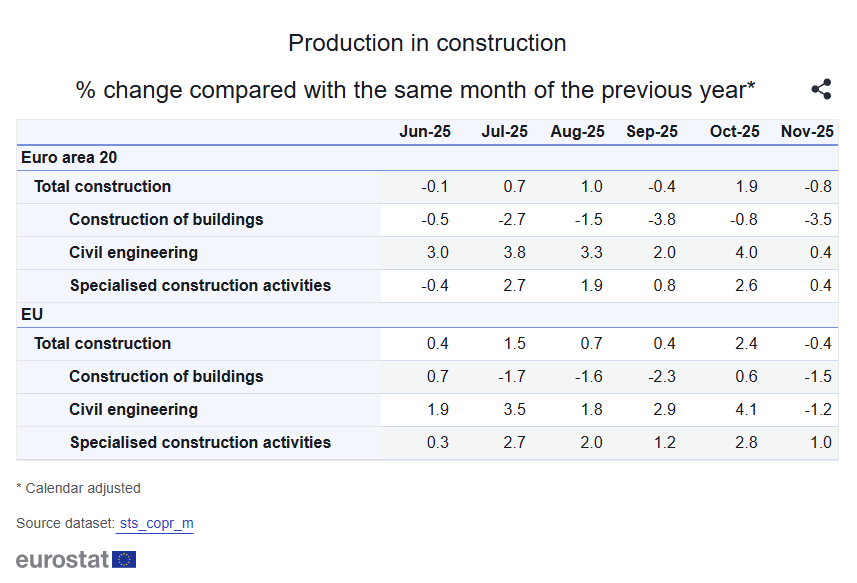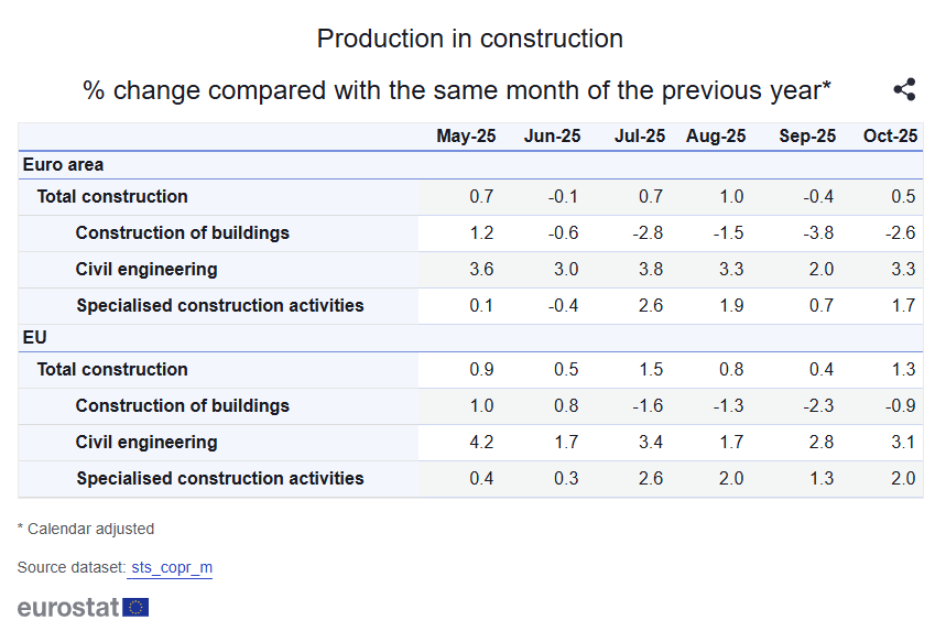 - YoY, euro area buildings were -3.3% while civil engineering +1.6% and specialized activities +0.2%; in the EU, buildings -0.7% with civil engineering +0.9% and specialized activities +1.1%, pointing to lingering weakness in building construction.
