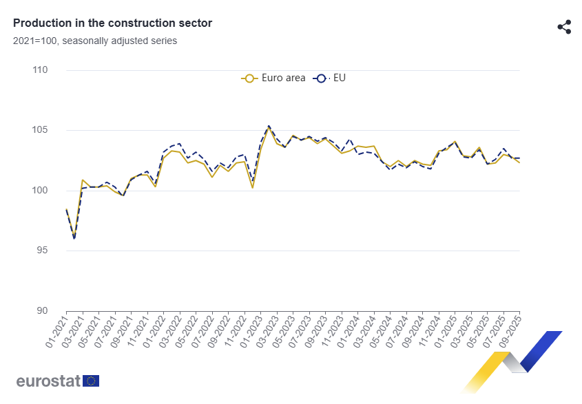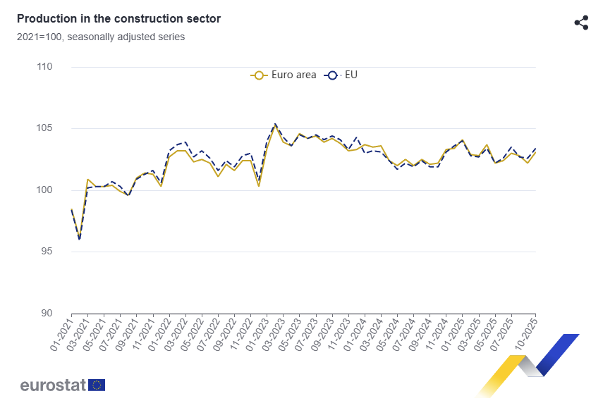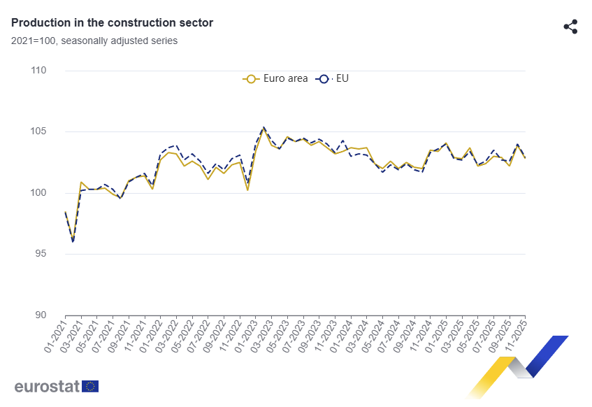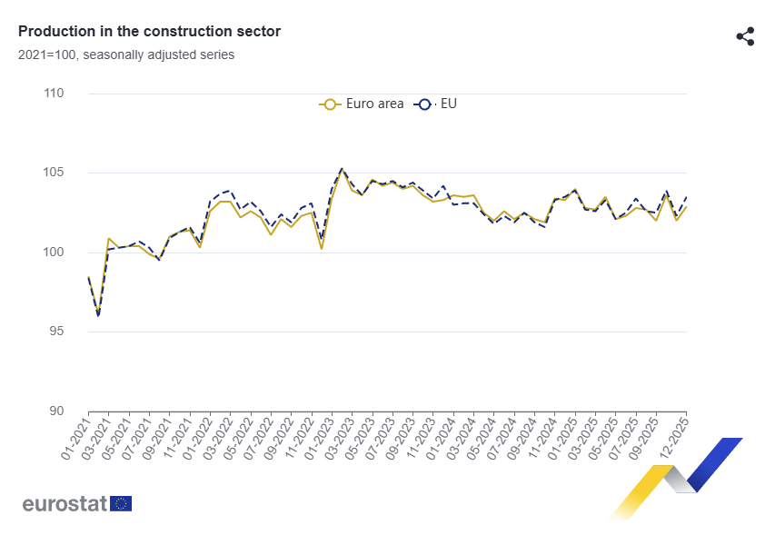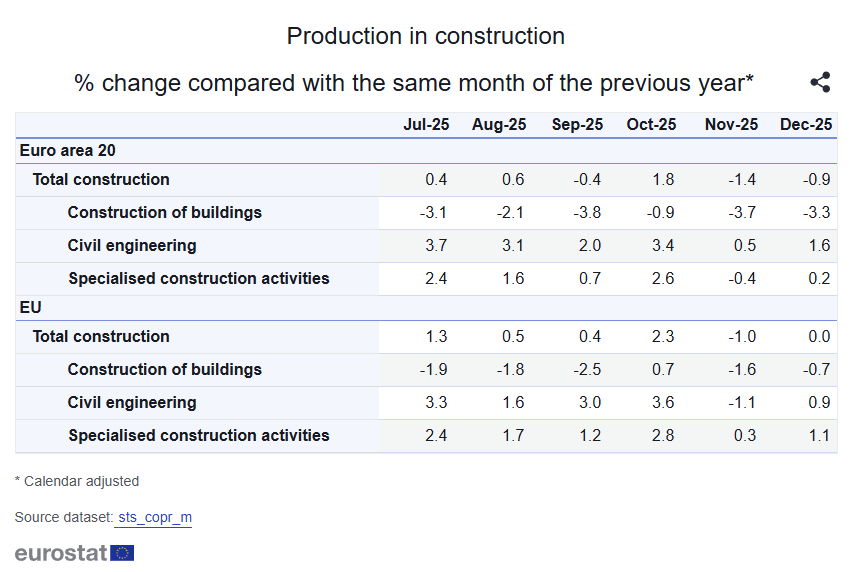 Euro area construction production rose 0.9% MoM and fell 0.9% YoY in Dec 2025, while EU output rose 1.2% MoM and was flat YoY, signaling a month-end rebound after November's drop.
