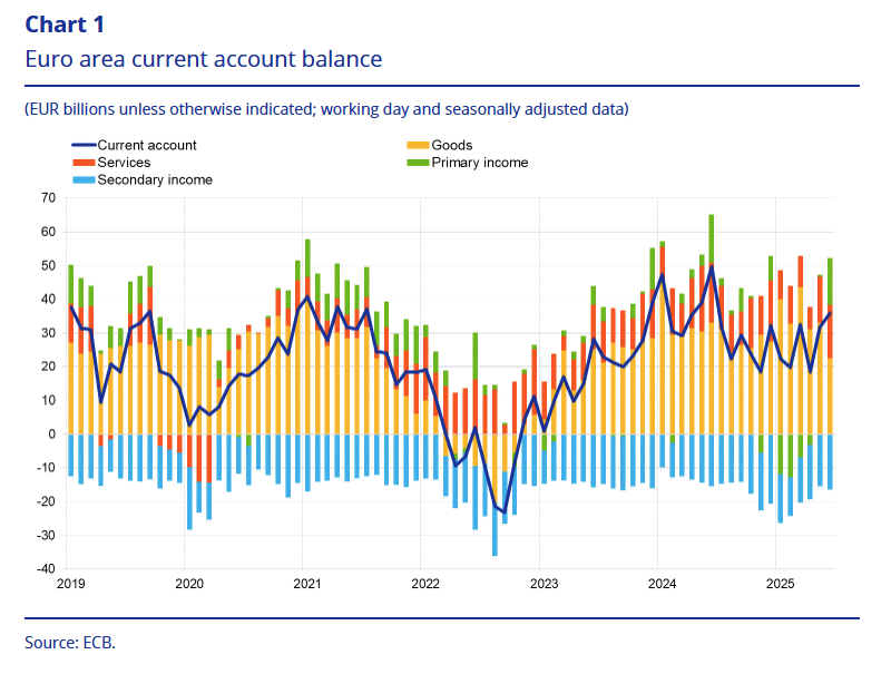 Over the 12 months to July 2025, the current account surplus narrowed to €315 billion (2.0% of GDP) from €394 billion (2.6%) a year earlier, driven by a swing in primary income (from +€41 billion to –€2 billion) and a larger secondary income deficit.