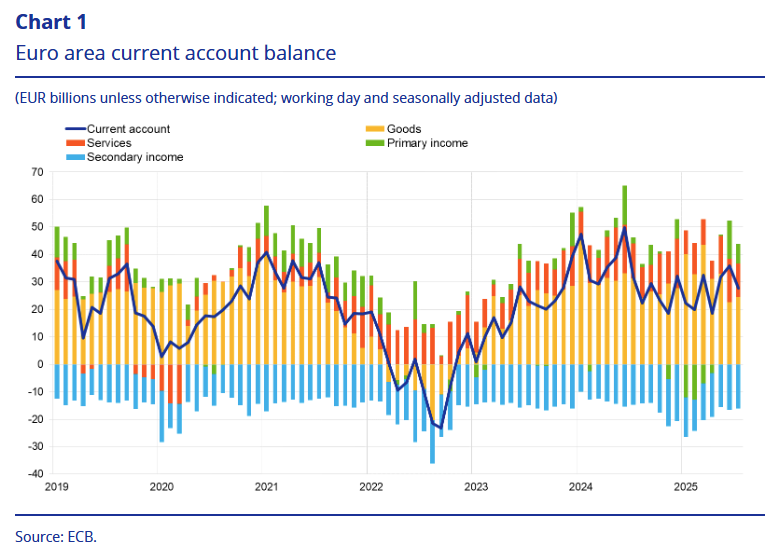 Goods posted a €25 billion surplus, services €12 billion, and primary income €7 billion, while secondary income registered a –€16 billion deficit.