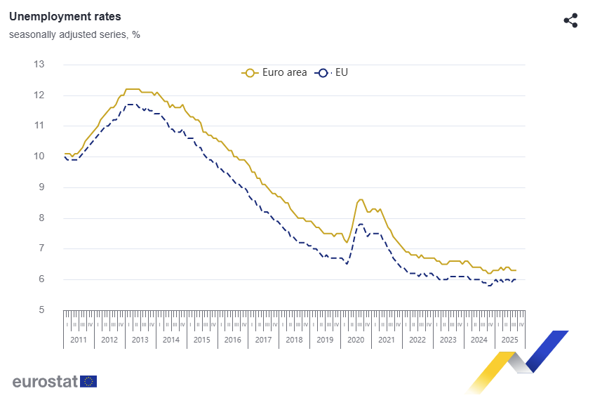 The euro area unemployment rate held at 6.3% (vs 6.3% expected) in September 2025 (unchanged MoM and YoY), while the EU rate was stable at 6.0% MoM and up slightly from 5.9% YoY, indicating overall labor market stability.