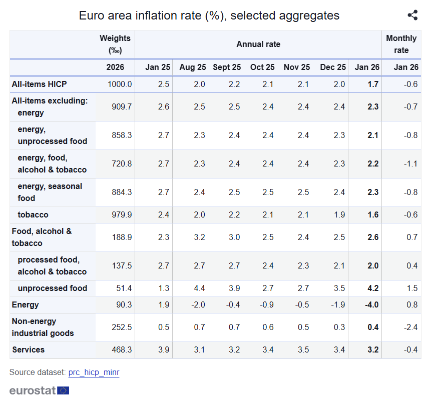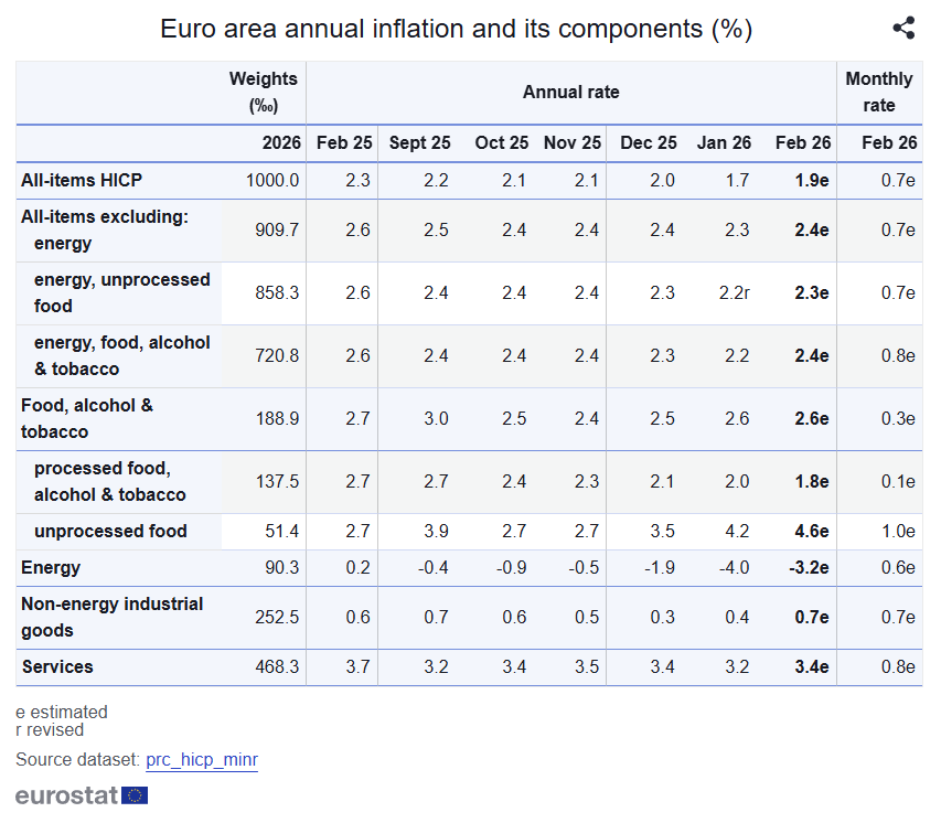 Euro area HICP inflation rose to 1.9% YoY in February 2026 (Jan: 1.7%) and increased +0.7% MoM, indicating a modest reacceleration in headline prices driven by food and services alongside a smaller energy drag.