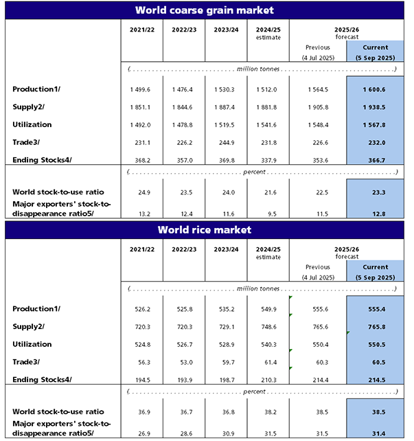 World wheat production is forecast at 809.7 million tonnes in 2025, up 0.6 percent compared to the previous month and now 1.3 percent above the 2024 output. Most of this month’s increase is linked to Australia, where favourable July-August rains, following a dry start of the season in parts, boosted yield expectations and lifted the 2025 production forecast to a level now on par with the five-year average. Forecasts for the European Union and the Russian Federation are also raised on stronger yields. Global coarse grains production in 2025 is forecast at 1 605 million tonnes, up 0.3 percent from last month’s figure and now 91.7 million tonnes higher than the 2024 outturn. The latest upward revision is principally driven by a higher forecast in Brazil, linked to better-than-expected yields. Maize production has also been raised for China (mainland), on newly released official data, and for the United States of America, tied to a larger area that outweighed a concurrent small cut to yields. At 427.1 million tonnes, the United States of America’s maize output would reach an all-time high and account for one-third of the global output, the highest share of global maize production since 2016. These increases offset cuts to production forecasts in the European Union, where dry and hot weather curtailed yield expectations, and in Mexico, where recent official figures point to a smaller-than-expected area. The forecasts for global barley and sorghum production in 2025 have also been raised marginally this month, largely reflecting improved prospects in Australia. As for rice, FAO has provisionally lowered its production forecast for Pakistan by 0.6 million tonnes (milled basis), owing to severe floods in Punjab, the country’s leading rice producing province. However, this downgrade is outweighed by 1.6 million tonne increase in production expectations for India, where a strong pace of Kharif crop plantings is reported, despite some challenges posed by deficient rains in some eastern and northeastern states and by floods in northwestern areas. As a result of these changes and various other smaller amendments, world rice production is now forecast to reach a record high of 556.4 million tonnes (milled basis) in 2025/26, up 1.0 million tonnes from September expectations and implying a 1.2 percent annual expansion.