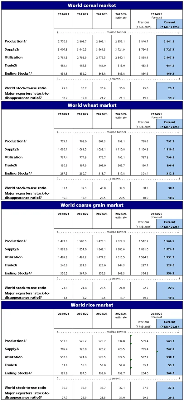 Despite an upward revision of 2.7 million tonnes this month, global cereal stocks ending in 2025 are still expected to decline by 1.9 percent compared to opening levels to 869.3 million tonnes. The global cereal stocks-to-use ratio is expected to decrease from 30.9 percent in 2023/24 to 29.9 percent in 2024/25, still indicating a comfortable global supply situation. World wheat stocks are anticipated to decline by 1.6 percent to 312.8 million tonnes, despite an upward revision of 4.4 million tonnes this month, mostly due to higher imports in Egypt, increased production in the Islamic Republic of Iran and reduced exports from the Russian Federation. By contrast, global coarse grain inventories are further reduced by 3.7 million tonnes, and are now forecast to be 4.8 percent below their opening levels. The downgrade is primarily due to lower imports in China (mainland) and reduced domestic production in Indonesia and the Russian Federation. World rice stocks at the close of 2024/25 marketing seasons are forecast to expand by 3.1 percent year-on-year to a record high of 206.0 million tonnes. This level stands 2.0 million tonnes above February expectations, as upgrades to stock forecasts for Cambodia and, especially India, outweighed cutbacks to expected reserves namely in Myanmar.