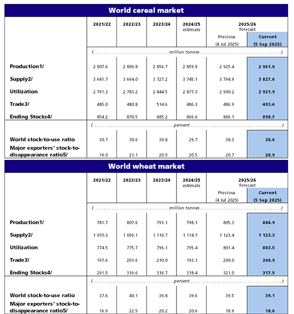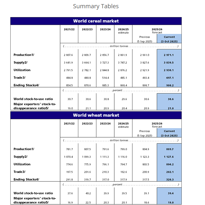 The forecast for world cereal stocks by the close of seasons in 2026 has been raised by 9.6 million tonnes since July, with global reserves now seen reaching 898.7 million tonnes, 3.7 percent above their opening levels and a record. This month’s upward revision is attributed to an upgrade to stocks of coarse grains, outweighing a downgrade to stocks of wheat. Among coarse grains, the bumper output in the United States of America is expected to result in significantly larger reserves of maize than previously anticipated with stocks in that country at the end of the 2025/26 season foreseen to reach a record level of over 50.0 million tonnes. Conversely, global wheat stocks are forecast lower than in July and are now expected to remain near to their opening levels after downward revisions to the Islamic Republic of Iran, where the production outlook is reduced and to the European Union, where a historical revision made to human consumption over previous seasons results in a lowering of 2025/26 ending stocks by 1.8 MMT. The global cereal stocks-to-use ratio in 2025/26 is expected to reach 30.6 percent, an increase of almost one percent on the previous season, confirming the comfortable supply outlook. World rice stocks at the close of 2025/26 marketing years remain forecast to expand by 2.0 percent to a record high of 214.5 million tonnes, sustained by buildups namely in Brazil, China, India, and Thailand, which could overshadow drawdowns namely in Indonesia, Madagascar, and the United States of America.