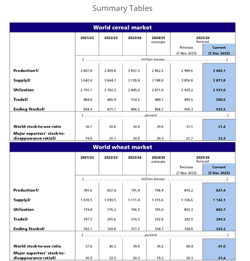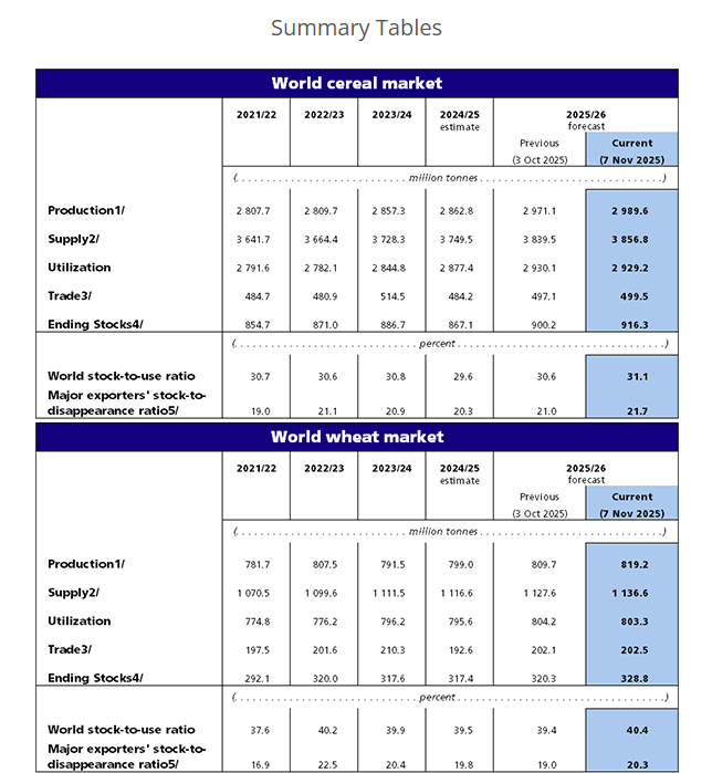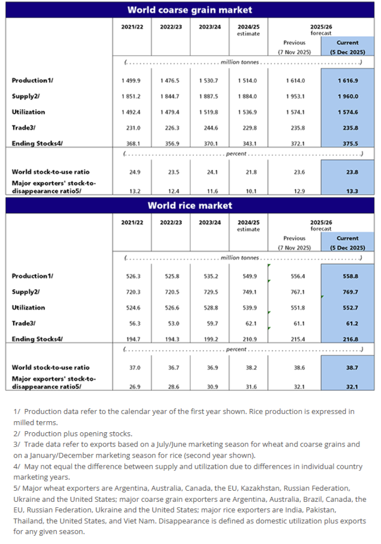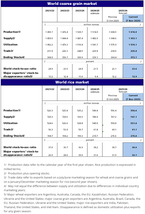 FAO’s forecast for world cereal utilization in the 2025/26 season is now expected to reach a record level of 2 930 million tonnes following an upward revision of 8.1 million tonnes since September. At 1 575 million tonnes, the forecast for total utilization of coarse grains in 2025/26 is up 7.2 million tonnes since the previous report and 33.8 million tonnes (2.2 percent) higher than the 2024/25 level. This month’s upward revision mostly reflects higher use of maize and barley in feed rations and for industrial purposes. Plentiful supplies of maize are forecast be directed to animal feed in the leading producers Brazil and the United States of America, and in importing countries such as Egypt and Mexico. Wheat use in 2025/26 is also seen at a record level of 804.2 million tonnes with both feed use and human consumption expected to rise, the latter in line with population growth with per-capita food consumption broadly unchanged year on year. World rice utilization is forecast at a historical peak of 550.8 million tonnes in 2025/26, little changed from September expectations and up 2.0 percent from 2024/25.