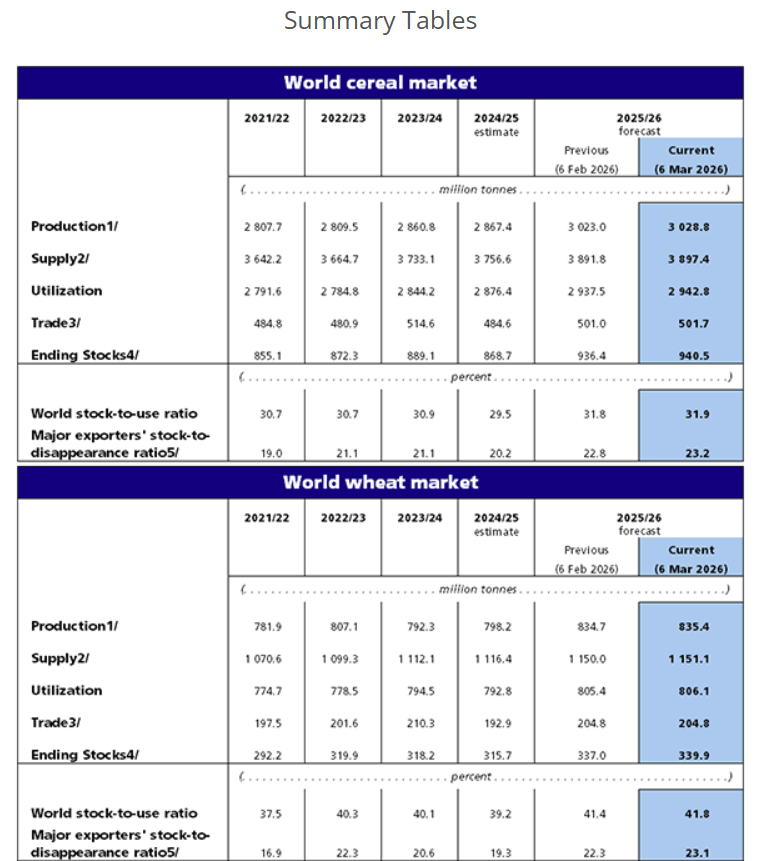 With the bulk of the 2026 global wheat crop already in the ground and to be harvested in the coming months, FAO’s forecast has remained mostly stable this month. At 820 million tonnes, production is foreseen to decline by 1.7 percent in 2026 yet still exceed the five-year average. However, conflict escalation in the Near East - and the resulting pressures from higher energy and fertilizer prices on production costs and disruptions to supply chain routes - has introduced additional uncertainty into the outlook, particularly for 2026 wheat crops yet to be planted in southern hemisphere countries and for spring wheat crops in countries north of the equator. Tightening margins, reflecting higher input costs alongside flat or weaker crop prices, could also influence planting decisions for 2026 maize crops in northern hemisphere countries, as farmers consider shifting towards less fertilizer-intensive crops, although the extent of the effect remains uncertain.