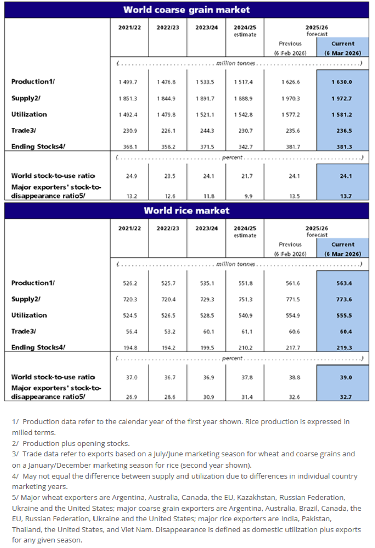World cereal stocks by the close of the 2026 seasons are raised once more and are now seen at a record level of 951.5 million tonnes, 9.2 percent higher than the previous year. The latest forecast reflects upward revisions to wheat stocks in the European Union, owing to a slower pace of exports, and in the Islamic Republic of Iran, following a faster-than-expected pace of imports. Wheat stocks are also revised upward in Uzbekistan on improved harvest estimates and in India, where maize ending stocks have been raised after confirmation of a higher-than-anticipated output. The world cereal stocks-to-use ratio at the end of seasons in 2025/26 is forecast to stand at 32.2 percent, further underlining the overall comfortable supply situation. World rice stocks at the close of 2025/26 marketing seasons are forecast to expand by 4.2 percent to an all-time high of 219.3 million tonnes, owing to expected accumulations among exporting countries (particularly India, but also Brazil, Thailand, and Viet Nam) and among rice importing countries (namely China, but also Bangladesh, and Indonesia).