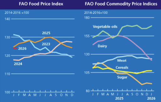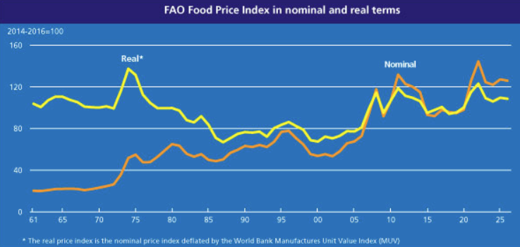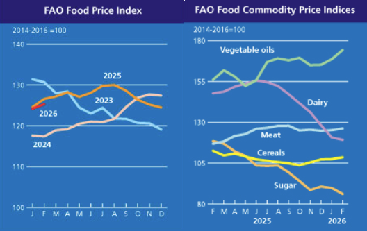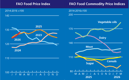 The FAO Food Price Index* (FFPI) averaged 128.5 points in March 2026, up 3.0 points (2.4 percent) from its revised February level, marking a second consecutive month of increase. Price indices across all commodity groups—cereals, meat, dairy, vegetable oils and sugar—rose to varying degrees, reflecting not only underlying market fundamentals but also responses to higher energy prices linked to the conflict escalation in the Near East. Compared to historical levels, the FFPI stood 1.2 points (1.0 percent) above its value a year ago but remained as much as 31.7 points (19.8 percent) below the peak reached in March 2022.