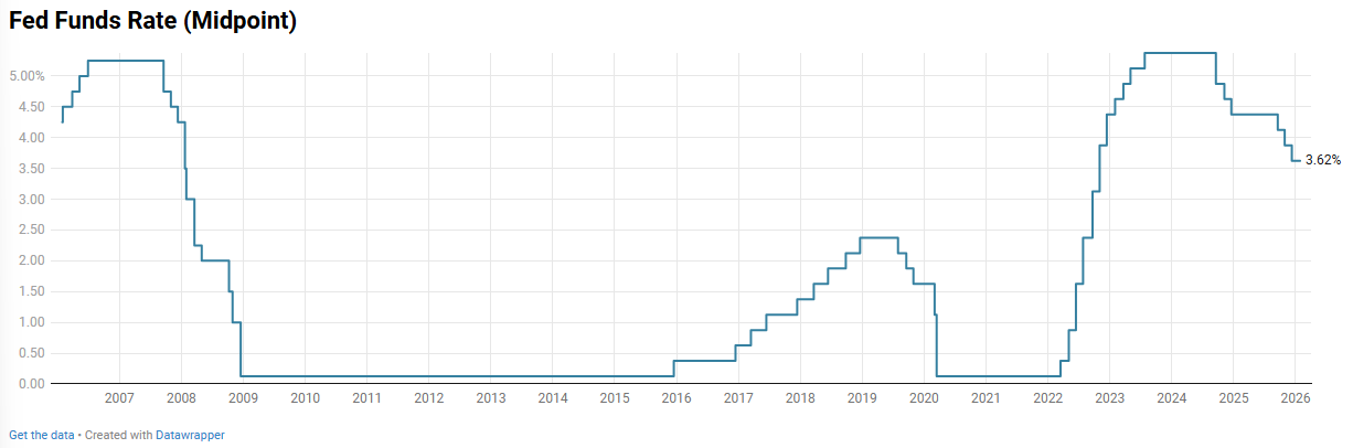 The FOMC left the policy rate unchanged at 3.50%-3.75%, marking the first pause after three straight cuts totaling 75 bps, which signals a transition away from active easing as members reassess incoming data.