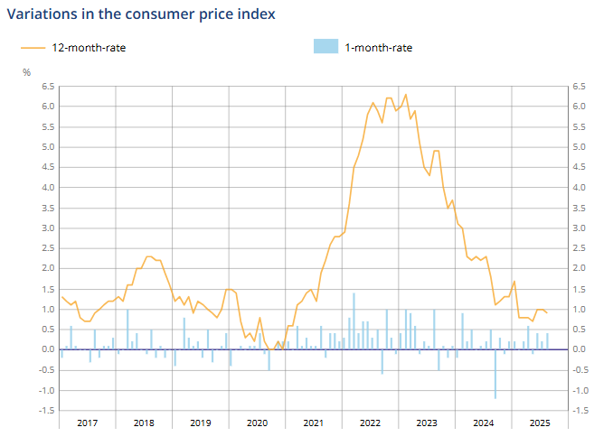 - Food inflation ticked up to +1.7% YoY (from +1.6%), supported by higher prices for meat (+1.8% YoY), bread/cereals (+0.9% YoY), and non-alcoholic beverages (+9.5% YoY), while sugar/confectionery slowed to +5.4% YoY.