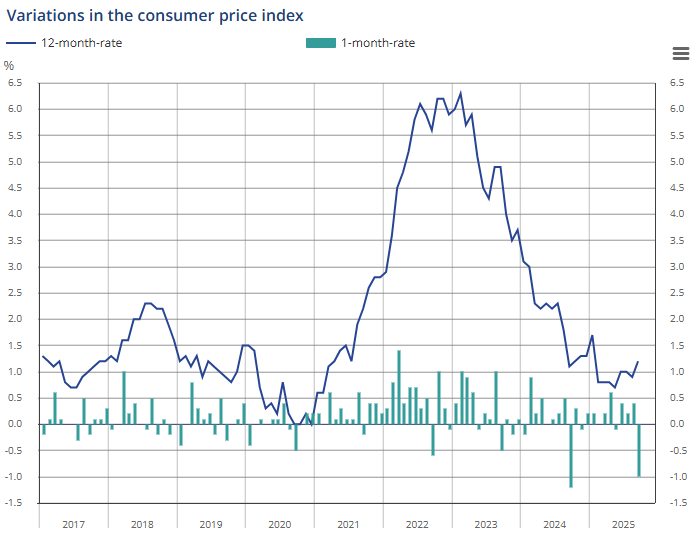France’s CPI fell -1.0% MoM in September 2025, following a +0.4% MoM increase in August, while the YoY rate rose to +1.2% YoY (from +0.9% YoY), confirming the flash estimates.