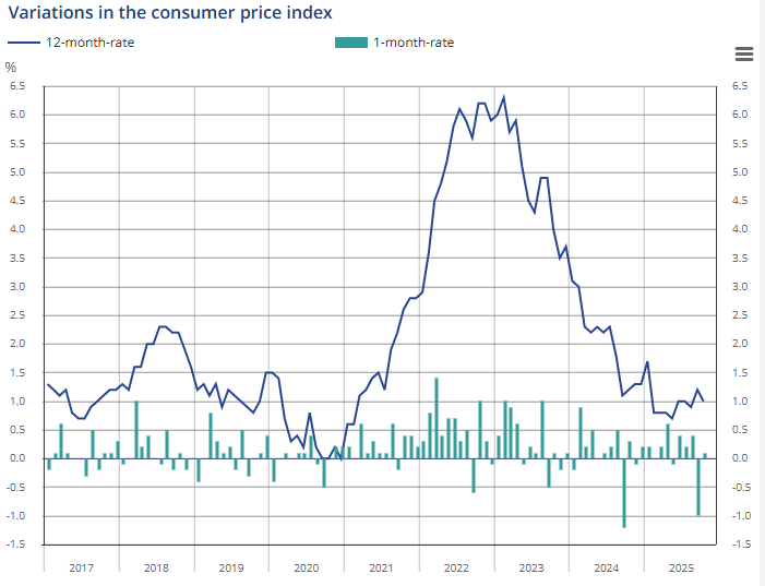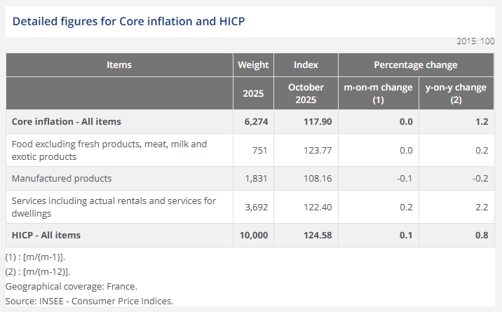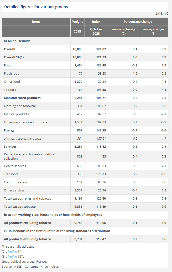 France’s CPI was unchanged at +0.9% YoY (vs 1.0% YoY expected) in November 2025 and fell -0.1% MoM, reflecting offsetting moves across major components and marking another month of subdued headline inflation.