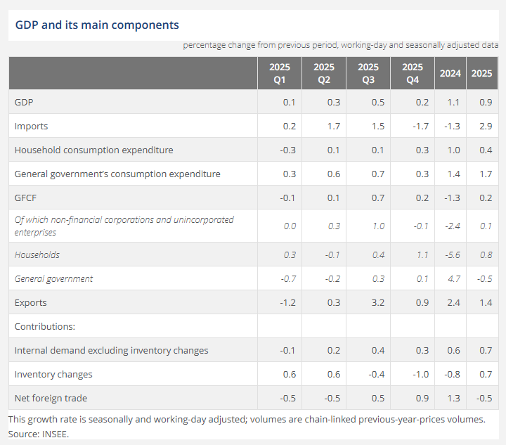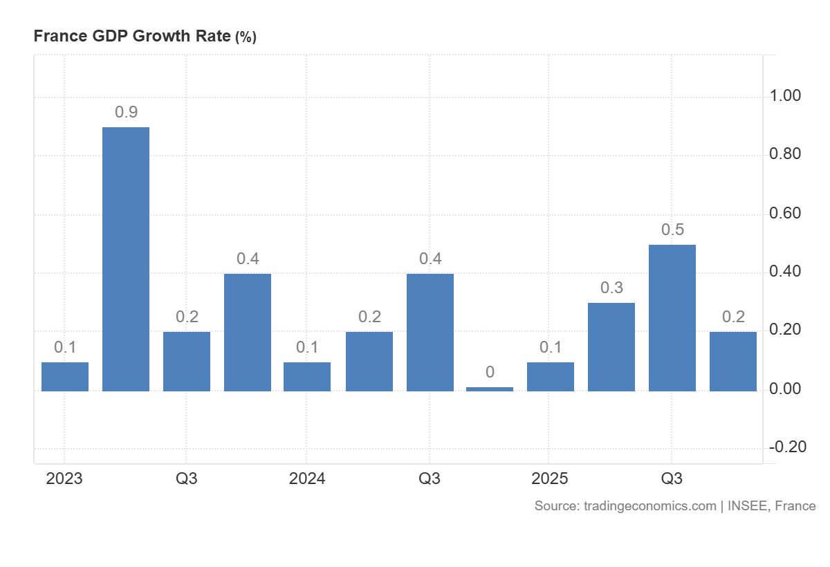 France's real GDP rose +0.2% QoQ in Q4 2025, confirming the preliminary estimate of a slower quarterly expansion to end the year.