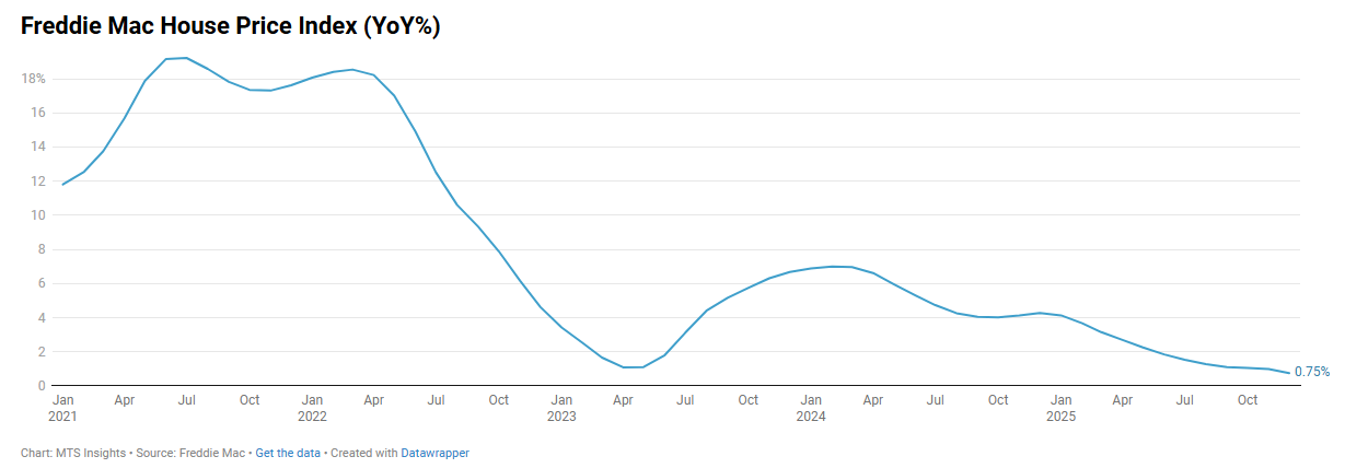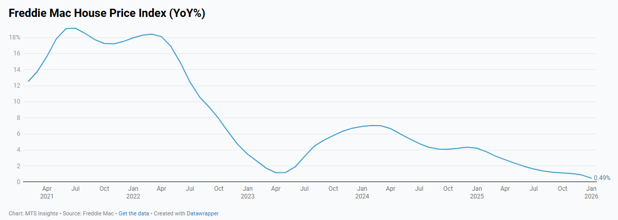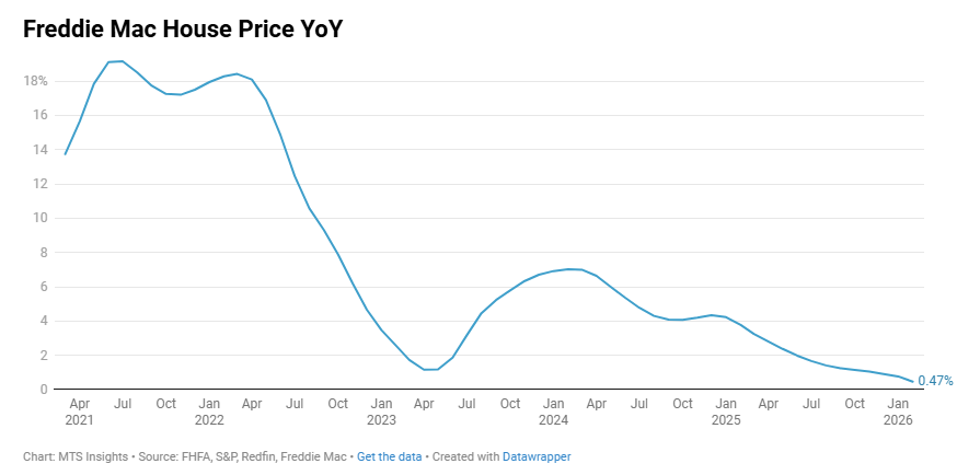 The Freddie Mac House Price Index was up 0.47% YoY in February, down from 0.77% YoY in January (revised up from 0.49% YoY in last month’s data).