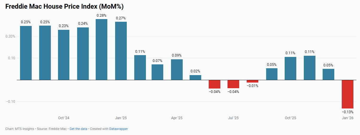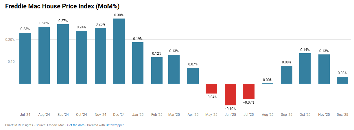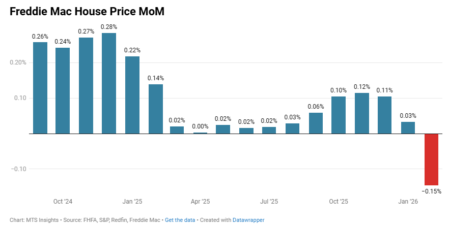 The index dropped -0.15% MoM in February, the largest drop since 2023. The last few months have seen upward revisions, flipping slight monthly declines to slight gains.