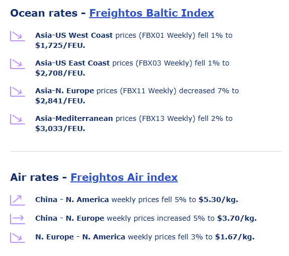 But Asia - Europe demand is likely stronger than last year. And despite volume strength and persistent congestion recently worsened by labor disruptions at some key ports, container rates slipped 9% to $1,747/FEU last week and are also back to 2023 levels, pointing to capacity growth as a key driver of current rate behavior.