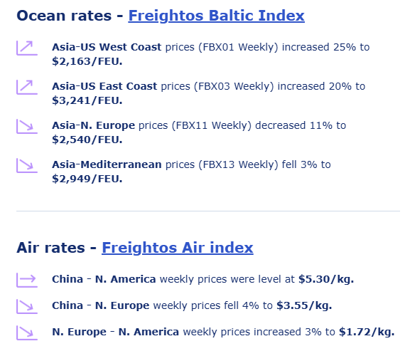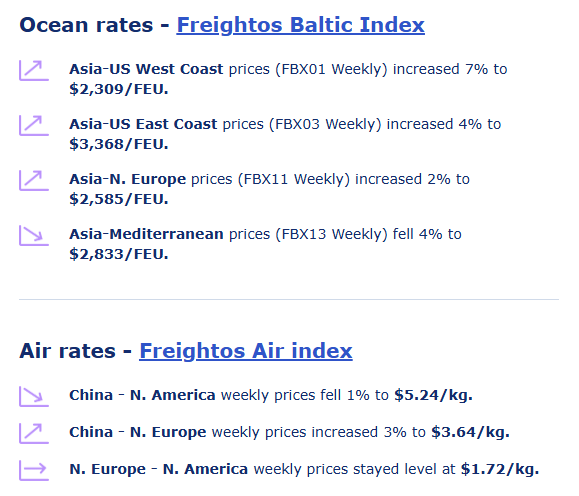 For air cargo, President Trump’s November 1st China tariff threat may be driving some recent increase in rates, though the government shutdown is also reportedly causing some congestion in the US and this time last year peak season demand had already started to pick up. Freightos Air Index China - US prices increased 19% last week back to mid-September levels of about $5.30/kg, though rates were approaching the $7.00/kg a year ago.