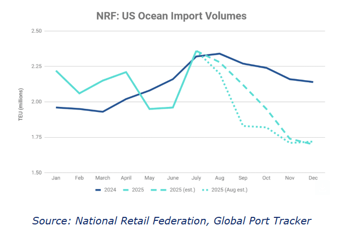But in the meantime, ocean rates have already fallen to their lowest levels since just before the start of the Red Sea crisis in late 2023. Transpacific rates dipped another 8% last week to about $1,400/FEU to the West Coast and $3,000/FEU to the East Coast. Current US import volumes estimated to be at their lowest since mid-2023 due to trade war frontloading earlier in the year – and projected to continue declining through December – are contributing, along with supply growth, to the strong downward pressure on transpacific container prices.