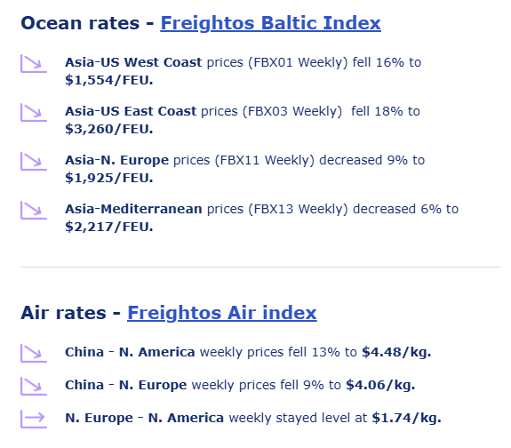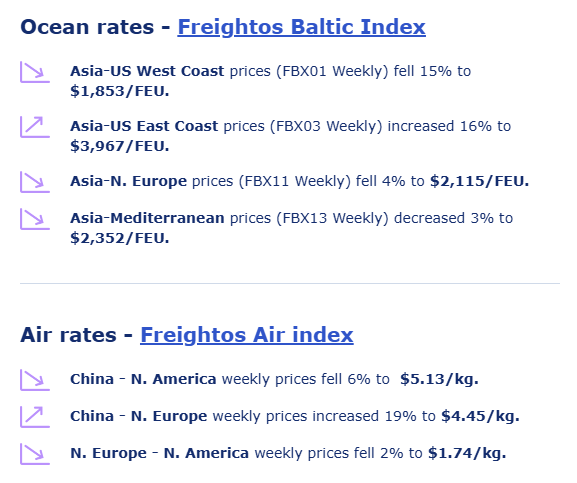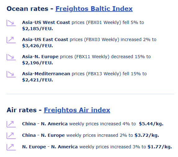 China - Europe prices fell 3% to $3.92/kg, but remain 5% higher than a month ago and about level with last October. The labor disruptions in Belgium impacting ocean freight are also causing air delays, especially to passenger flights, though so far cargo rates remain unaffected.