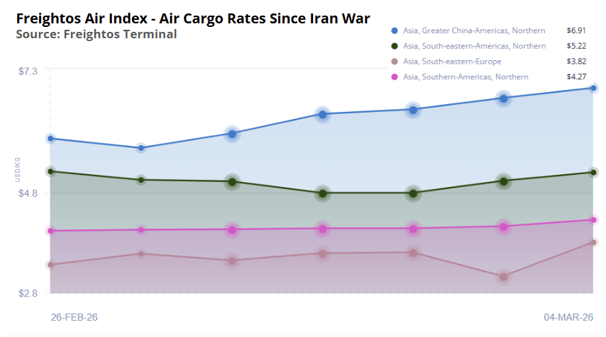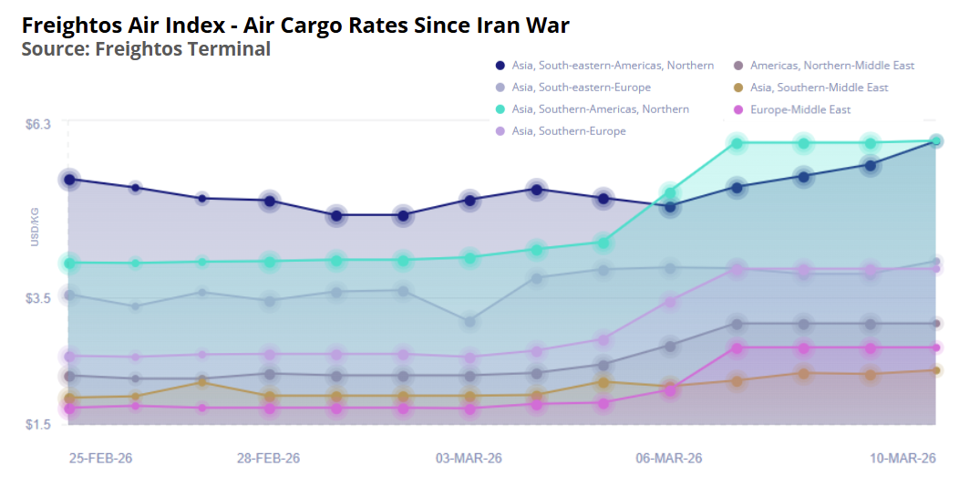 In air cargo, a more broad range of lanes have been impacted by airspace closures in the Gulf, with rates climbing significantly on a list of lanes.