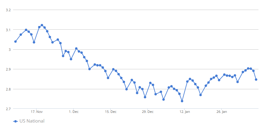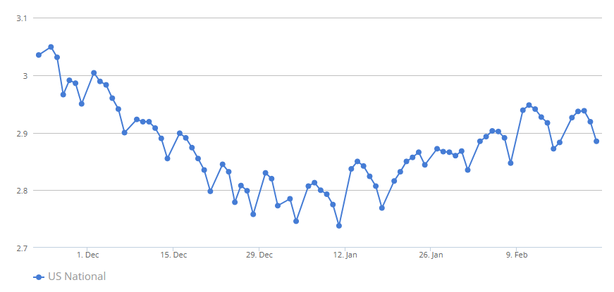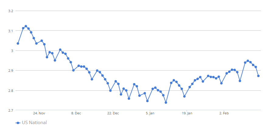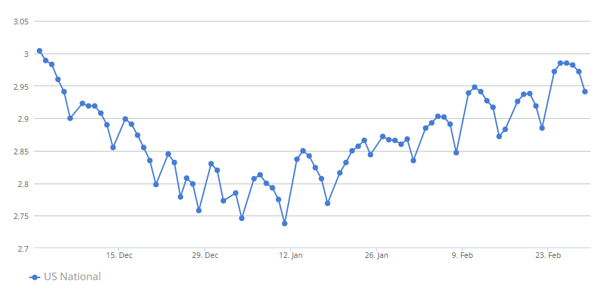 Regional price dispersion remained wide, with the highest state averages in California ($5.14), Washington ($4.58), and Hawaii ($4.33), while the lowest were in Kansas ($2.90), Oklahoma ($2.95), and Arkansas ($2.98).