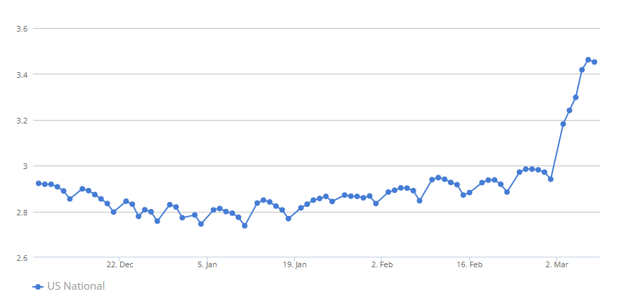 The U.S. national average gasoline price rose +$0.511 WoW to $3.45 per gallon (+$0.541 MoM; +$0.416 YoY), marking one of the fastest weekly increases in years as oil prices surged amid escalating Middle East tensions.