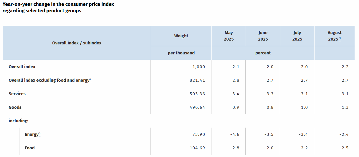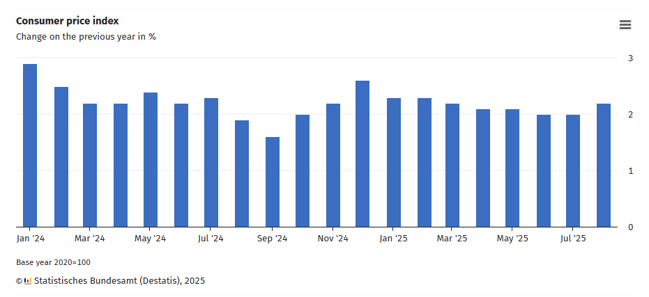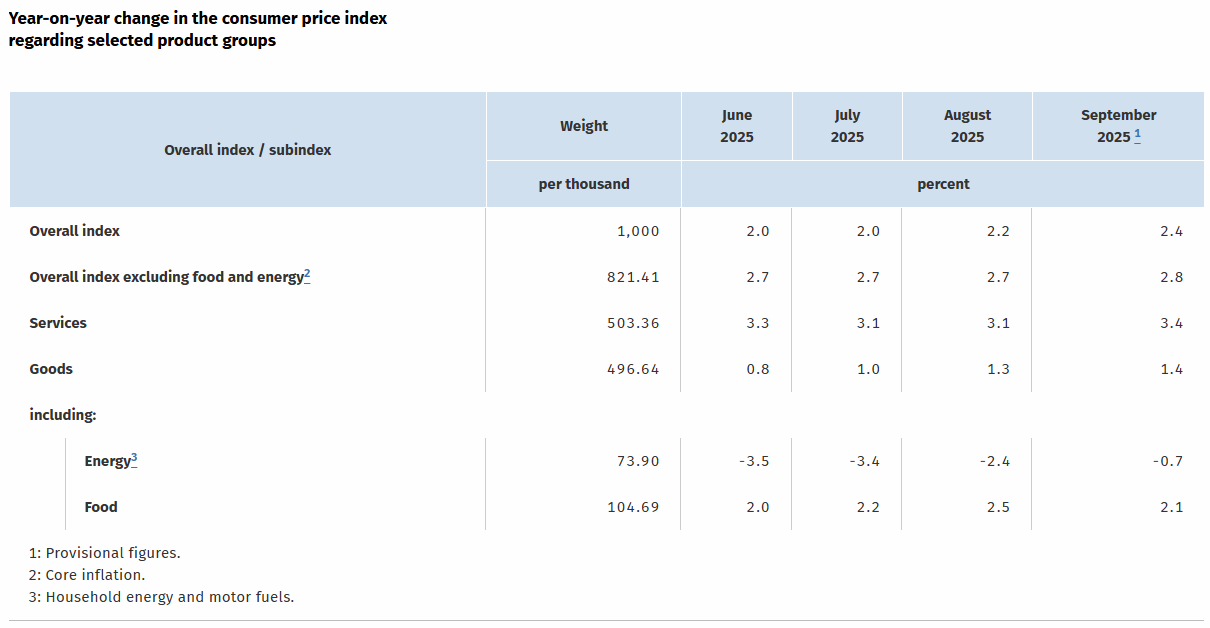 Germany’s consumer price index (CPI) rose +0.2% MoM and +2.4% YoY in September 2025, the second consecutive monthly uptick in inflation, following +2.2% in August, as service costs remained elevated and energy declines moderated.