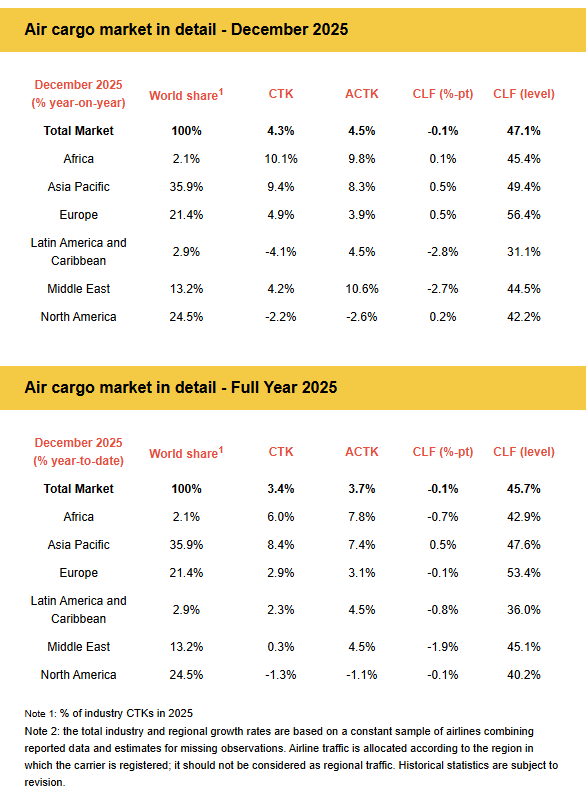 The International Air Transport Association (IATA) released data for full year 2025 and December 2025 global air cargo market performance showing: