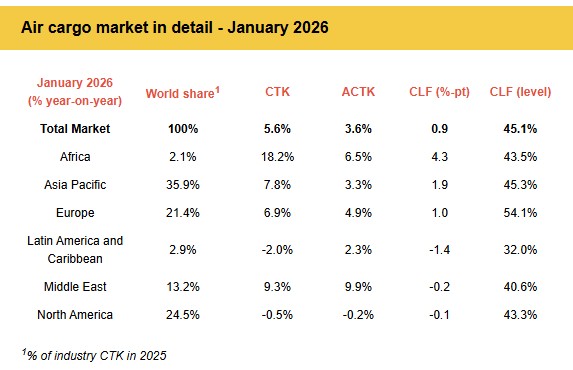 The International Air Transport Association (IATA) released data for January 2026 global air cargo markets showing: