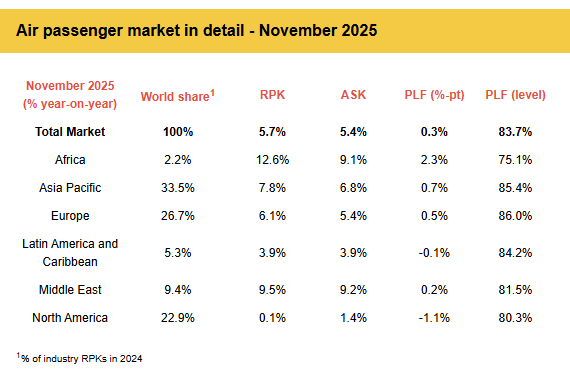 “November 2025 saw continued strong demand for air travel with year-on-year growth of 5.7%. Load factors reached a new record of 83.7% for the month as airlines continued to satisfy growing passenger demand amid continuing capacity constraints stemming from challenges in the aerospace supply chain. The new year’s resolution for the manufacturing sector must be to increase production to meet the needs of their airline customers. The backlog of more than 17,000 aircraft orders that we reached in 2025 must be reduced in 2026,” said Willie Walsh, IATA’s Director General.