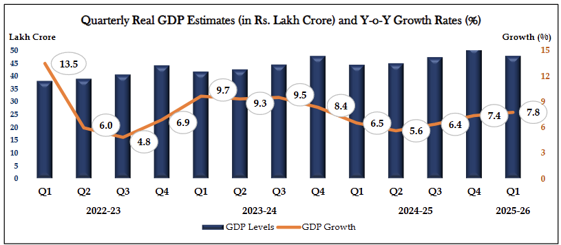 India’s GDP grew +7.8% YoY (vs 6.7% YoY expected) in Q1 FY2025–26 (Q2 2025), accelerating from +6.5% in Q1 last year and +7.4% YoY in the previous quarter, with broad-based strength across industry and services.