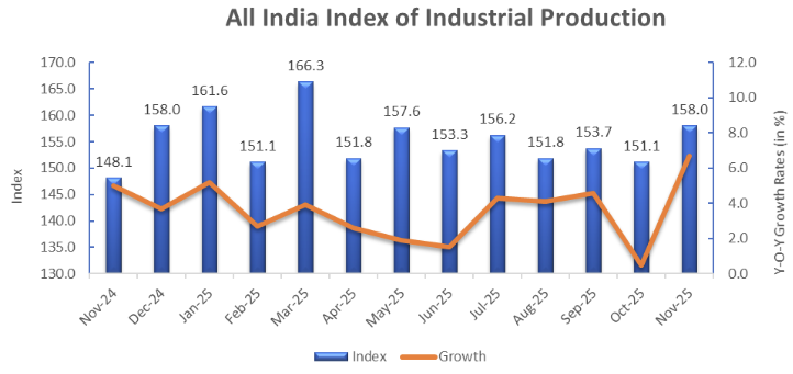India’s Index of Industrial Production rose +7.8% YoY in December 2025 (up from +6.7% YoY in November), marking the strongest reading in over two years.