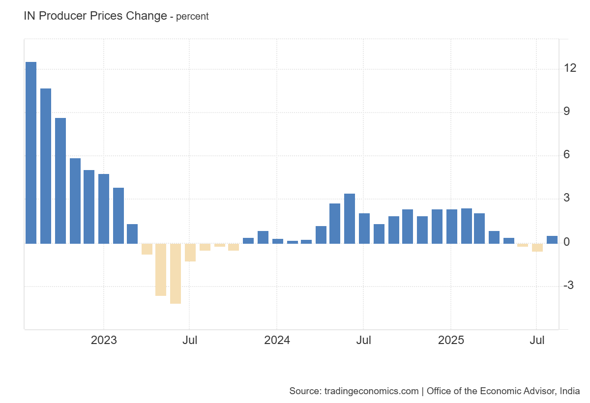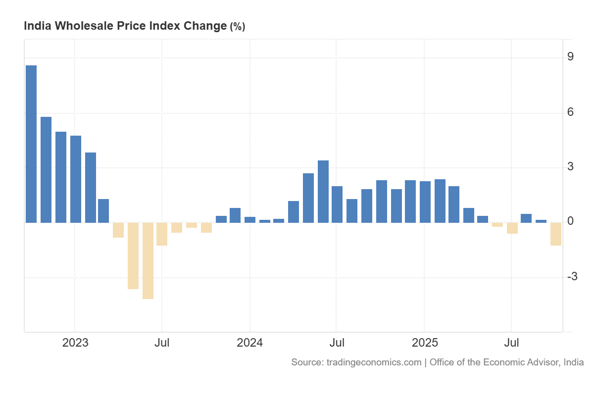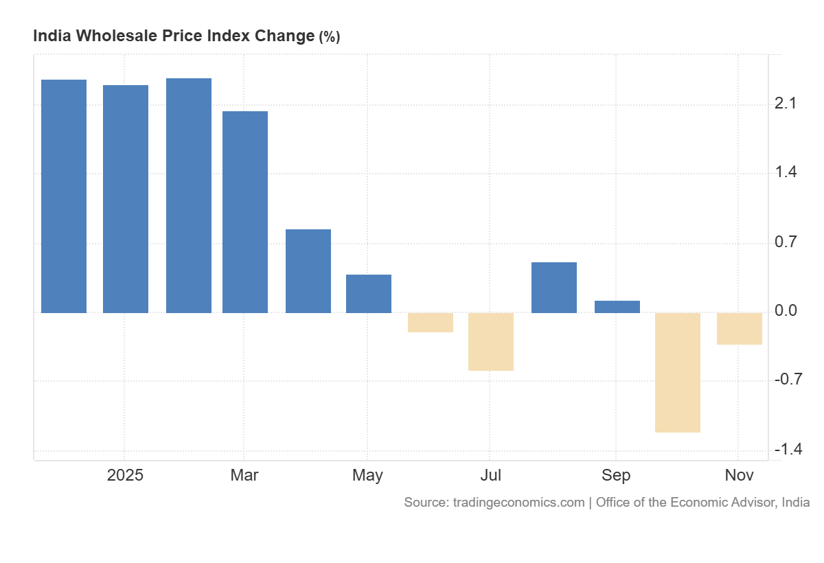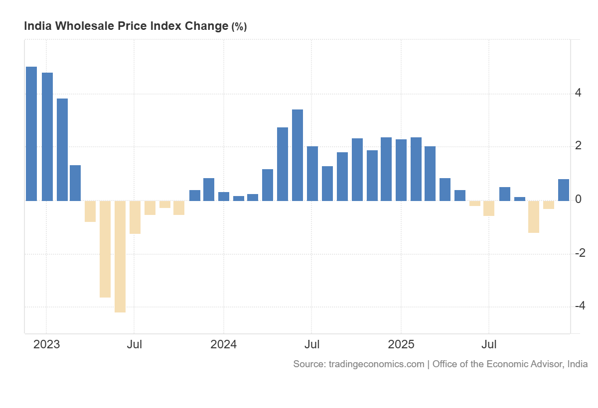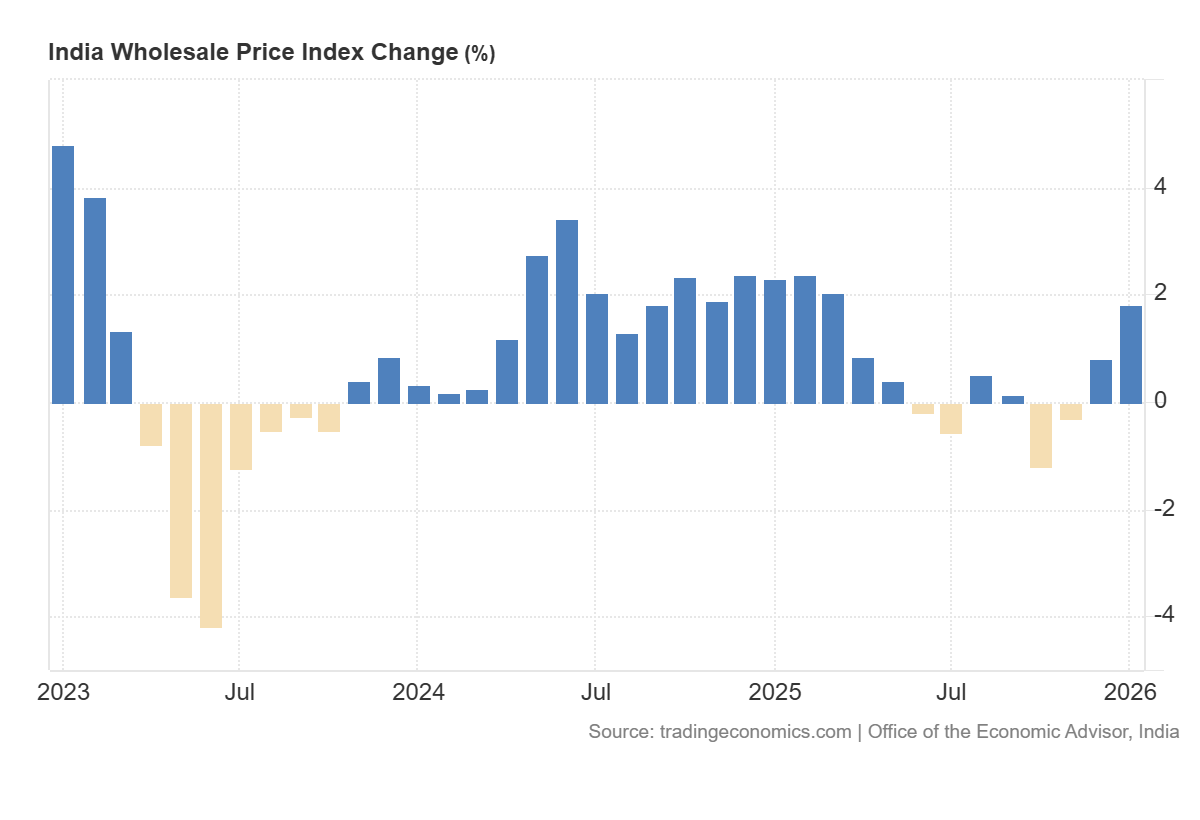 India’s WPI rose +0.51% MoM and +1.81% YoY (vs +1.25% YoY expected) in January 2026, extending the shift into positive wholesale inflation.