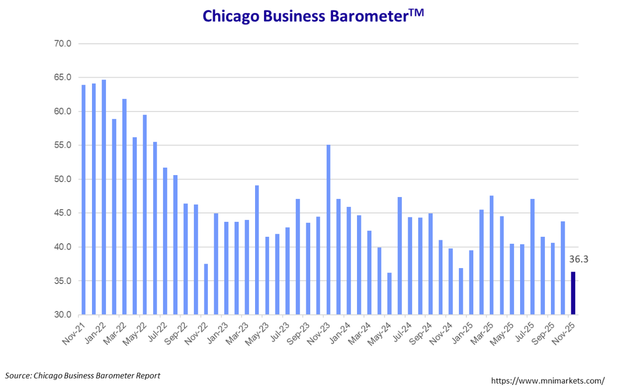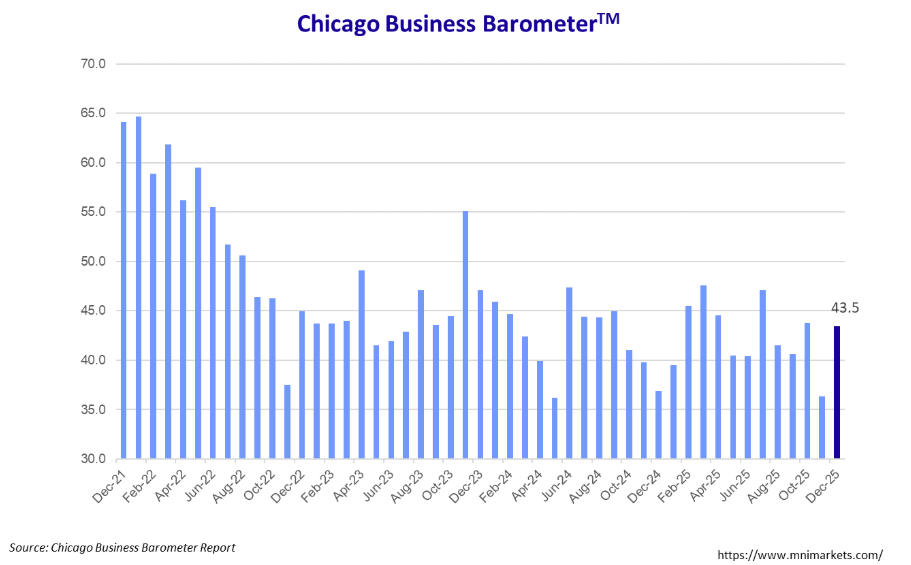 The ISM Chicago Business Barometer jumped 7.2 pts to 43.5 in December. The indicator has been below 50 since November 2023.