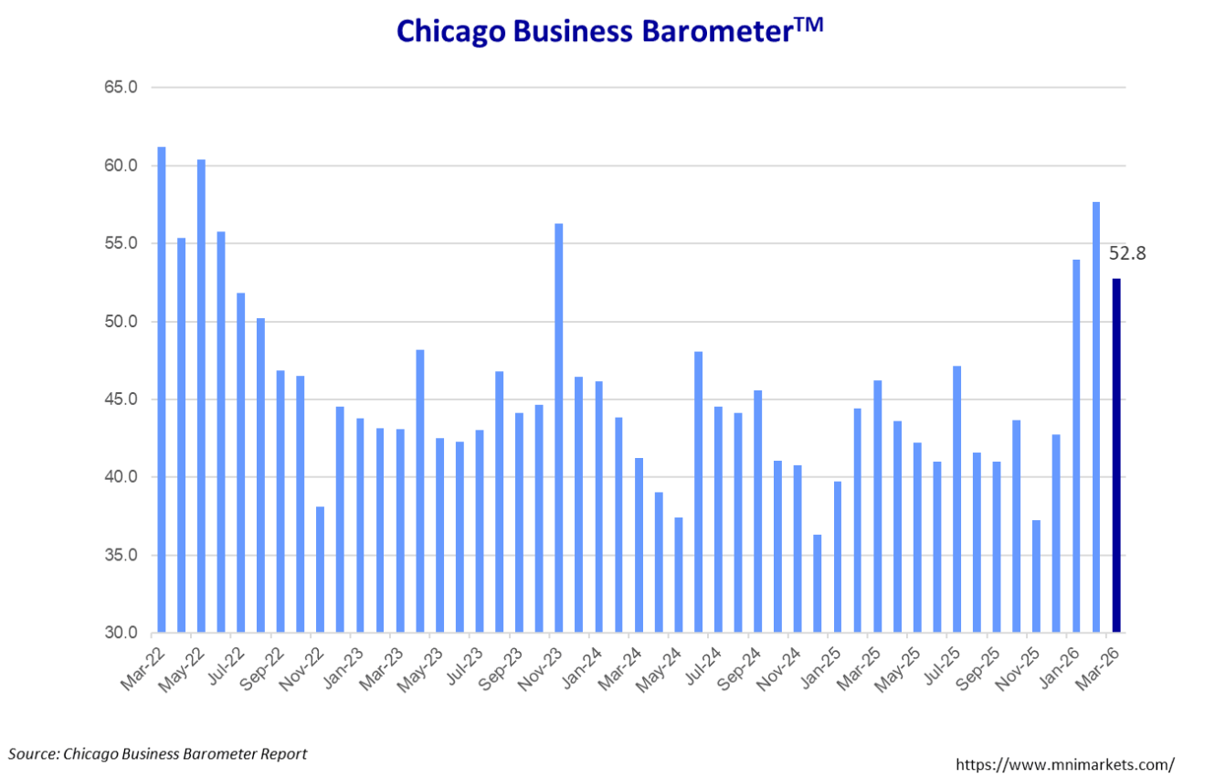 The Chicago Business Barometer tempered to 52.8 in March and is now 4.9 points below February's reading.