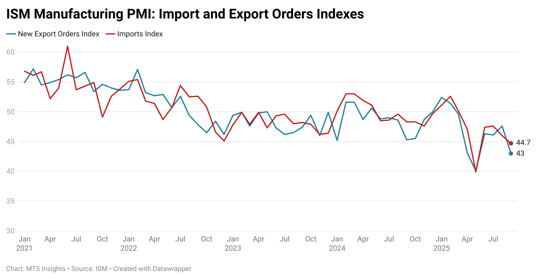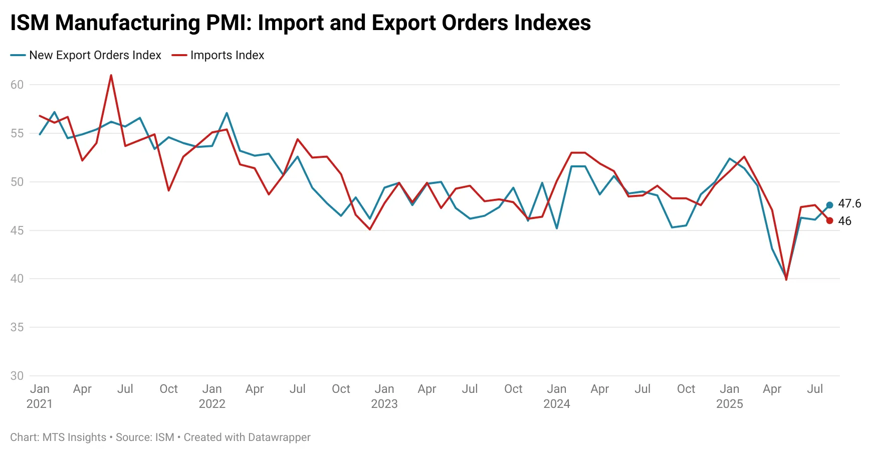 New Export Orders rose to 44.5 from 43.0 and Imports to 45.4 from 44.7, both still contracting, reflecting weak external trade flows.