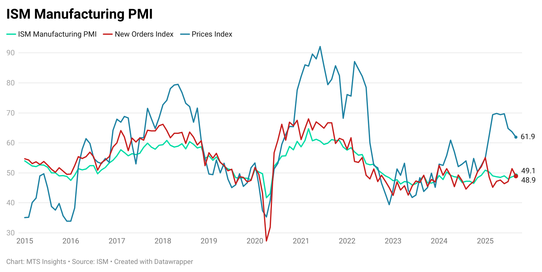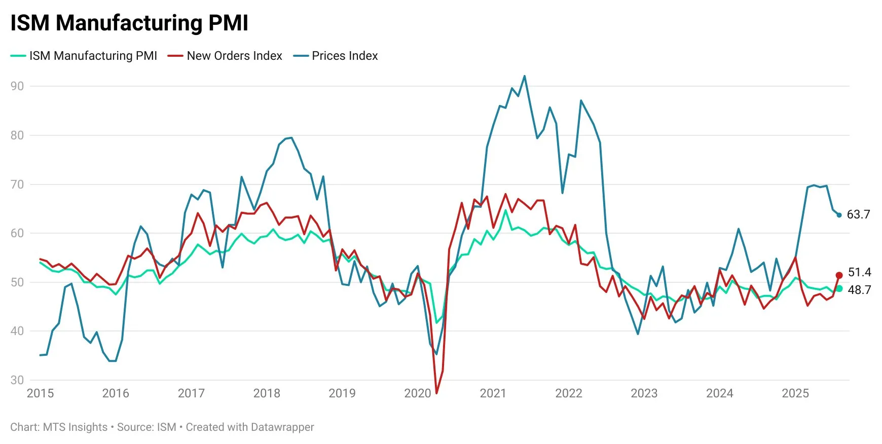 New Orders rose to 49.4 from 48.9 but stayed in contraction, indicating demand remains soft despite a slight improvement.