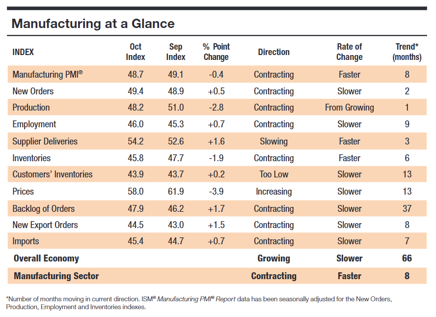 The US ISM Manufacturing PMI fell -0.4 pts to 48.7 in October 2025, marking a faster contraction while the broader economy continued to expand.