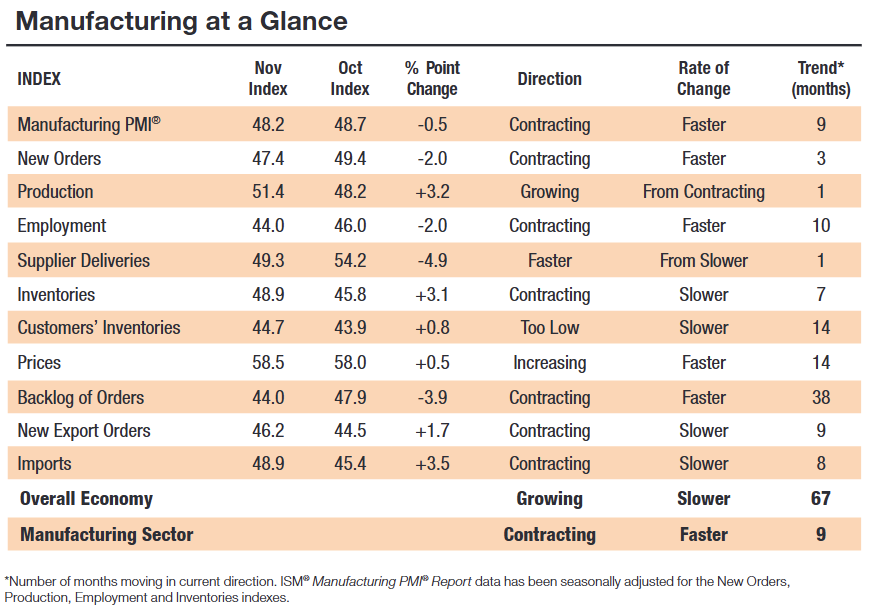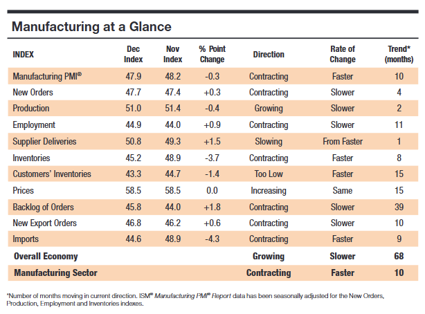 Manufacturing PMI at 47.9 (Nov: 48.2) stayed below the 50 threshold, extending the contraction streak to 10 months, though the level remained above 42.3, which ISM associates with continued overall economic growth.
