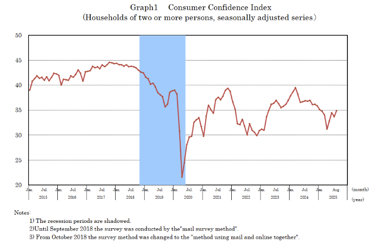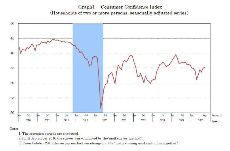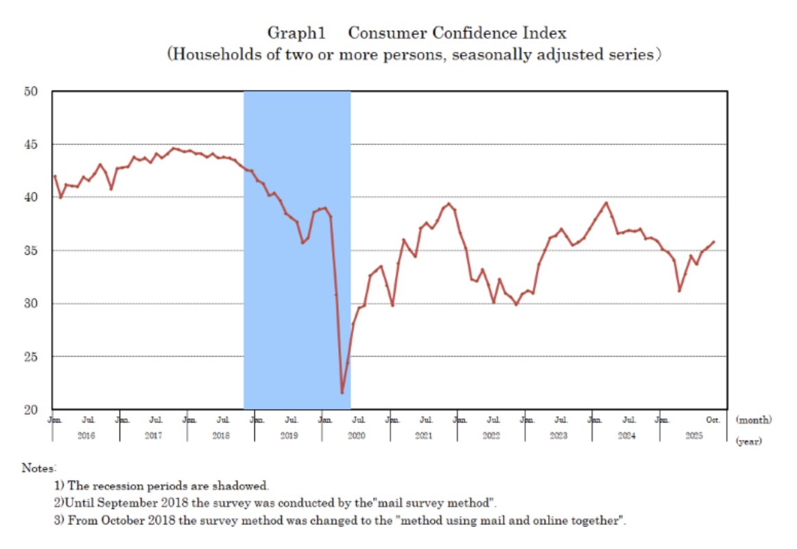 Japan’s Consumer Confidence Index rose +0.5 pts to 35.8 in October 2025, marking a modest improvement with broad-based gains across all subcomponents.