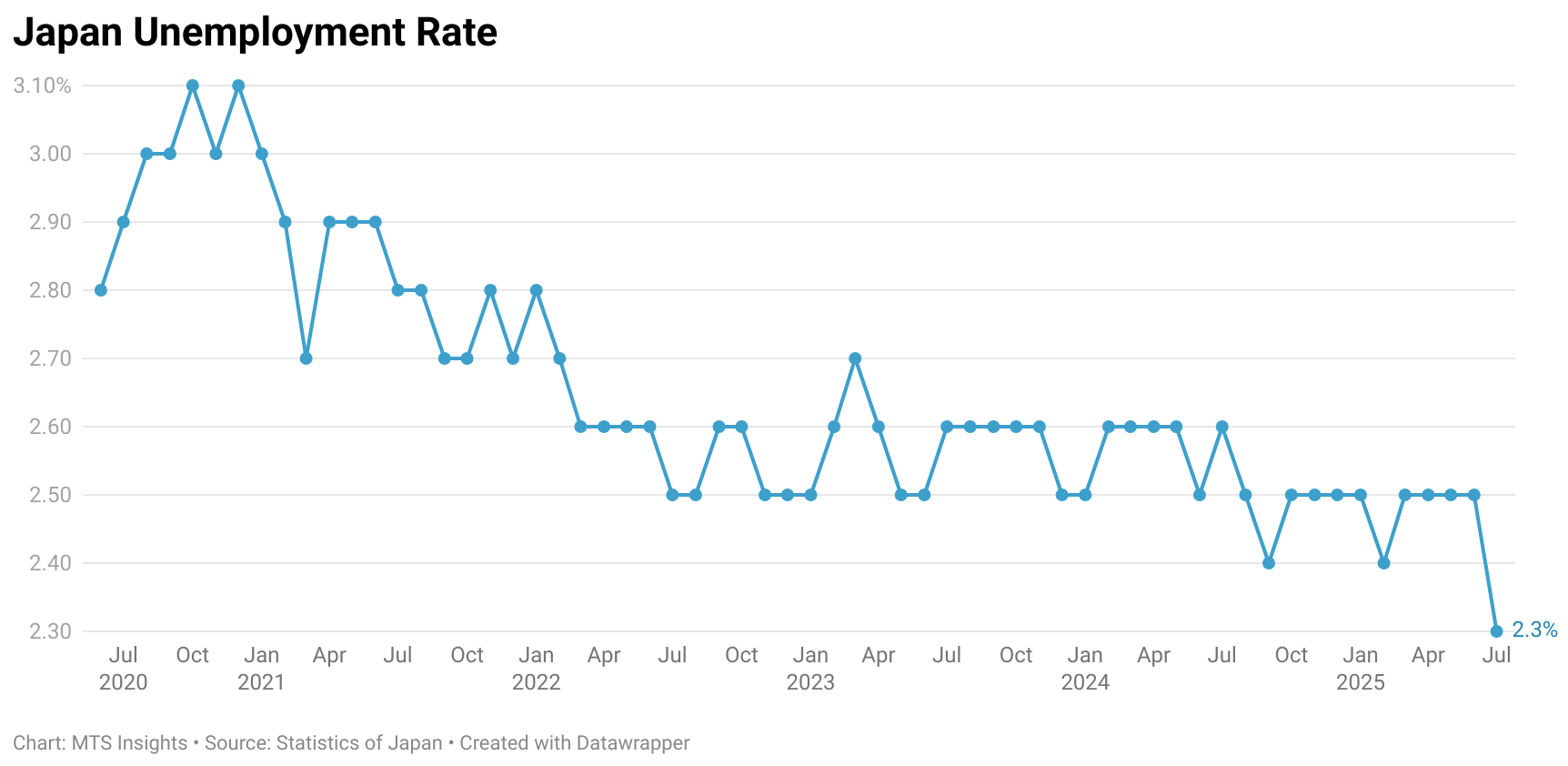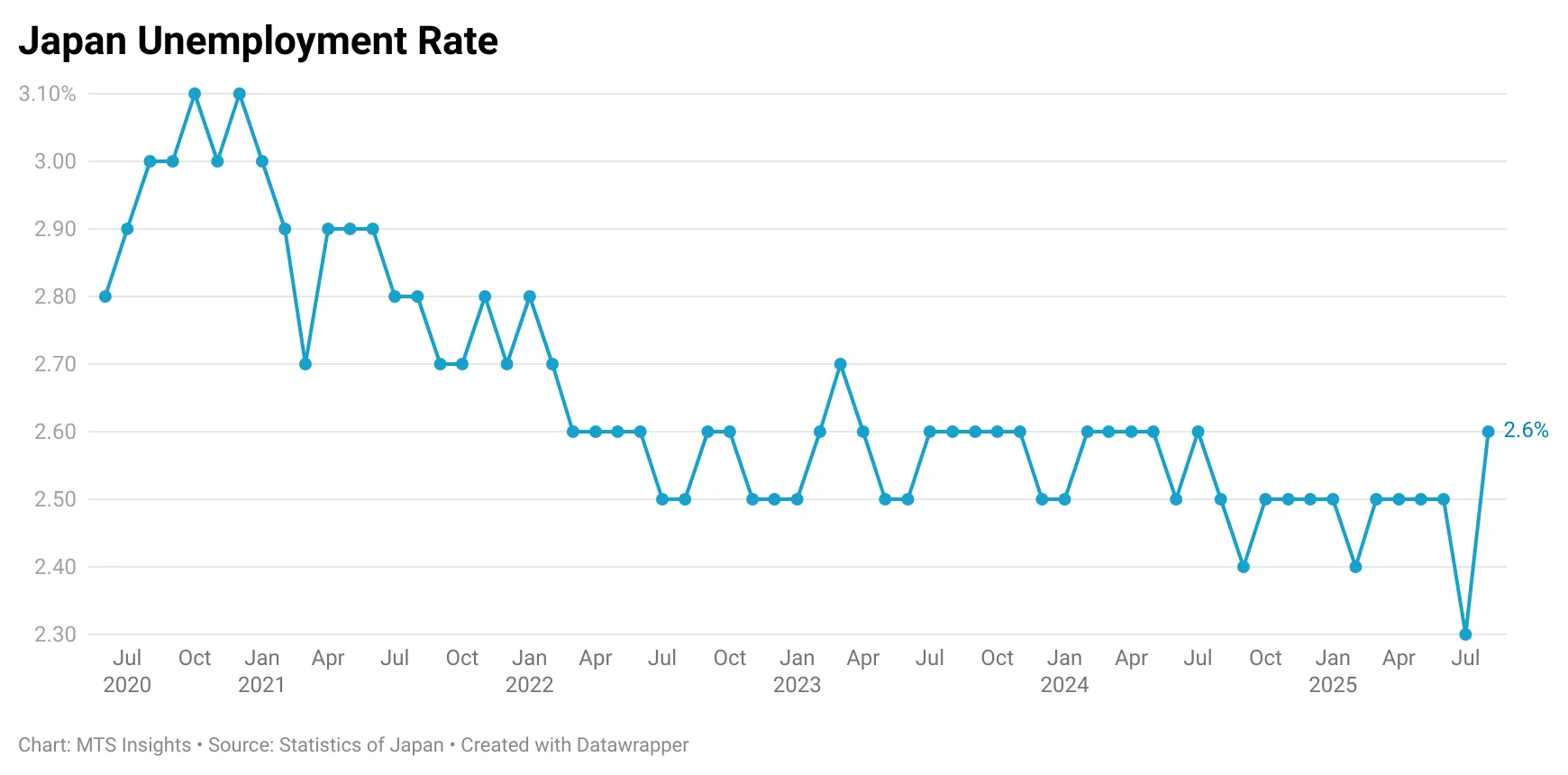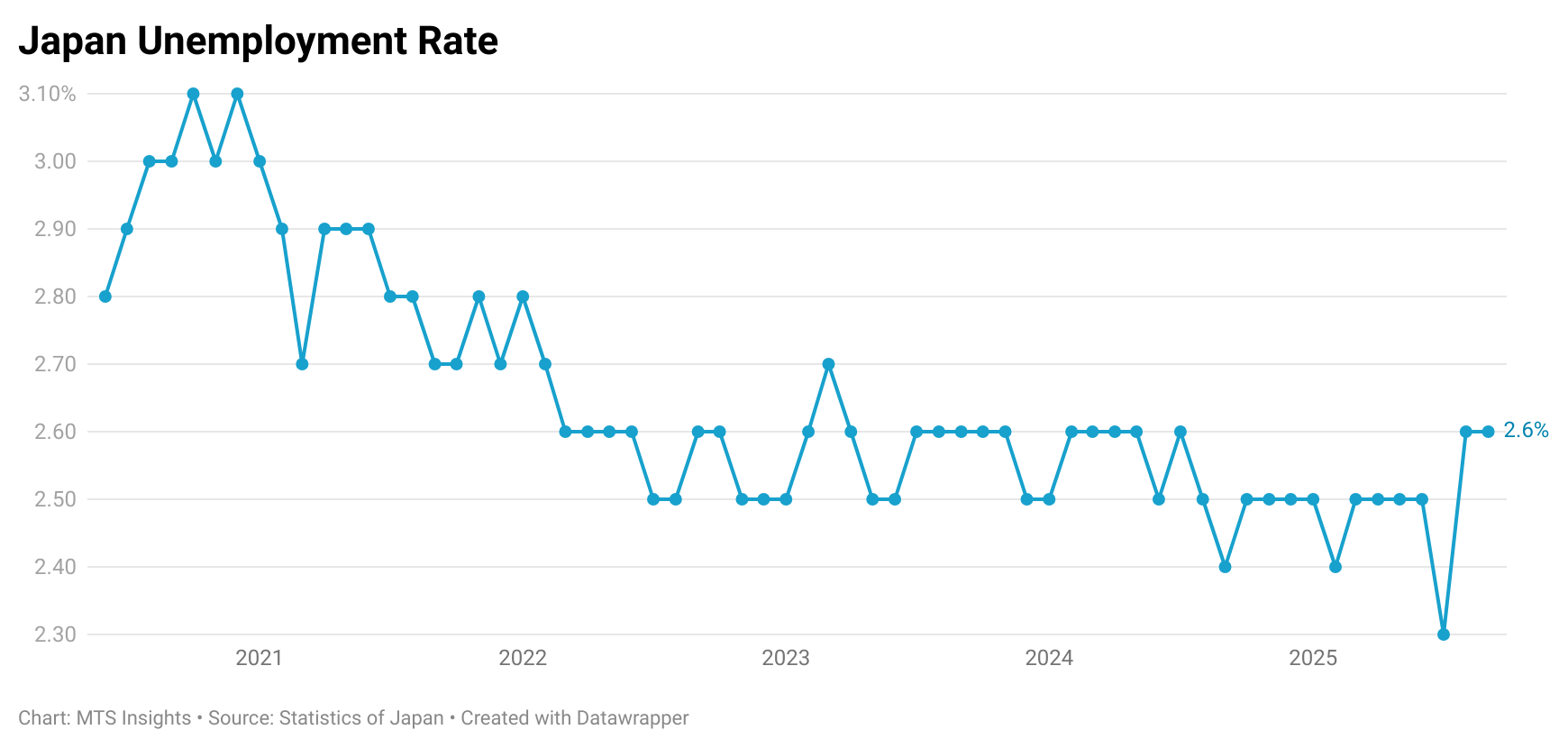 Japan’s unemployment rate remained unchanged at 2.6% (vs 2.5% expected) in October, remaining at the highest level since July 2024.