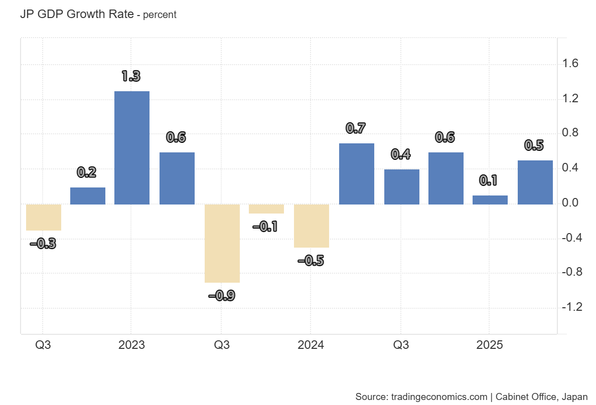 Japanese GDP fell -0.4% QoQ (vs -0.6% QoQ expected) in Q3 2025, a reversal from the relatively strong growth of 0.6% QoQ. This is the first contraction since Q1 2024.