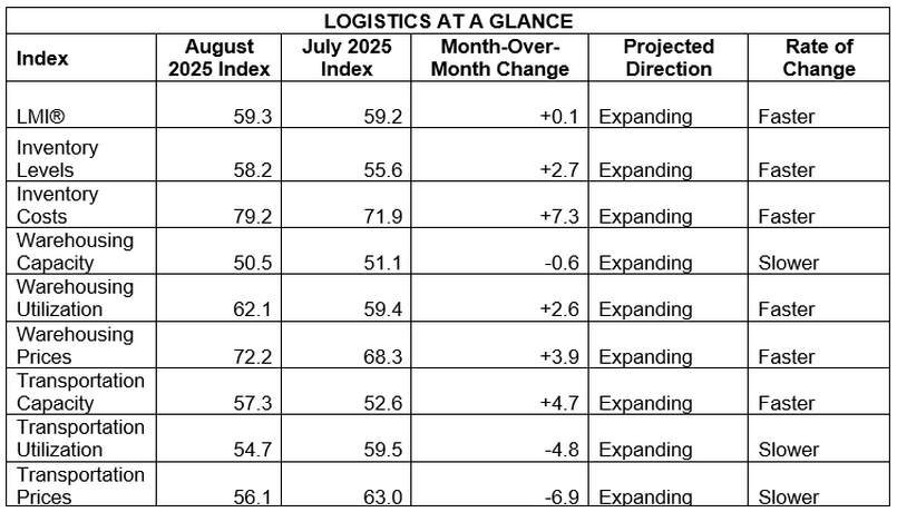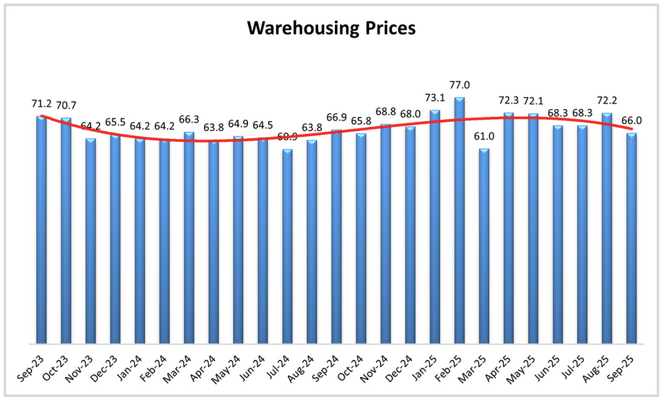 Warehousing Prices increased +1.8 pts to 67.7, suggesting pricing remains firm despite marginally softer utilization.