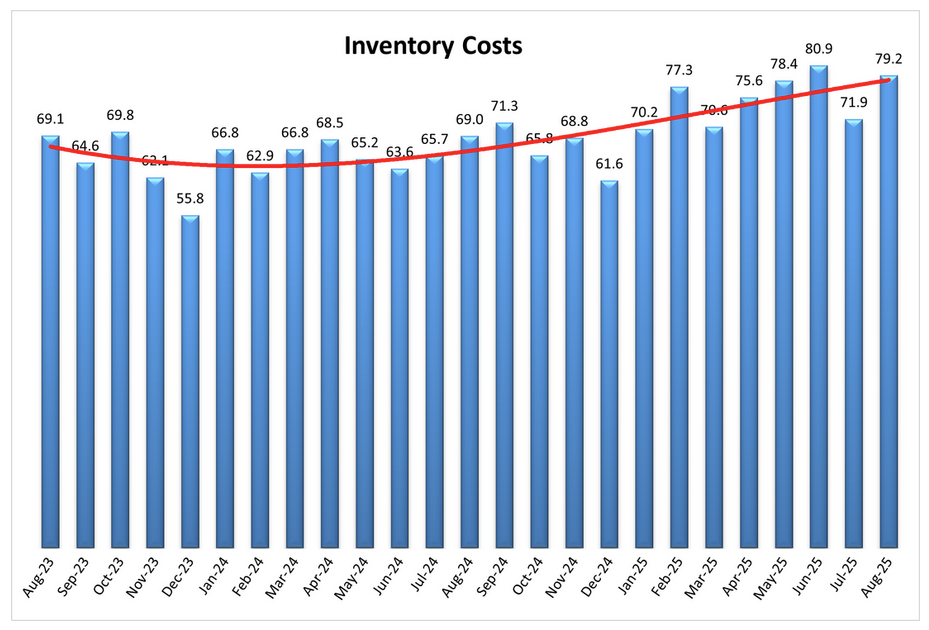 Inventory Costs decreased -2.3 pts to 73.2, still signaling strong upward cost pressure despite lower volumes.