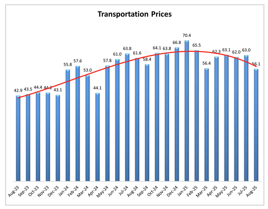 Transportation Prices rose +7.5 pts to 61.7, ending the two-month negative freight inversion as demand picked up.